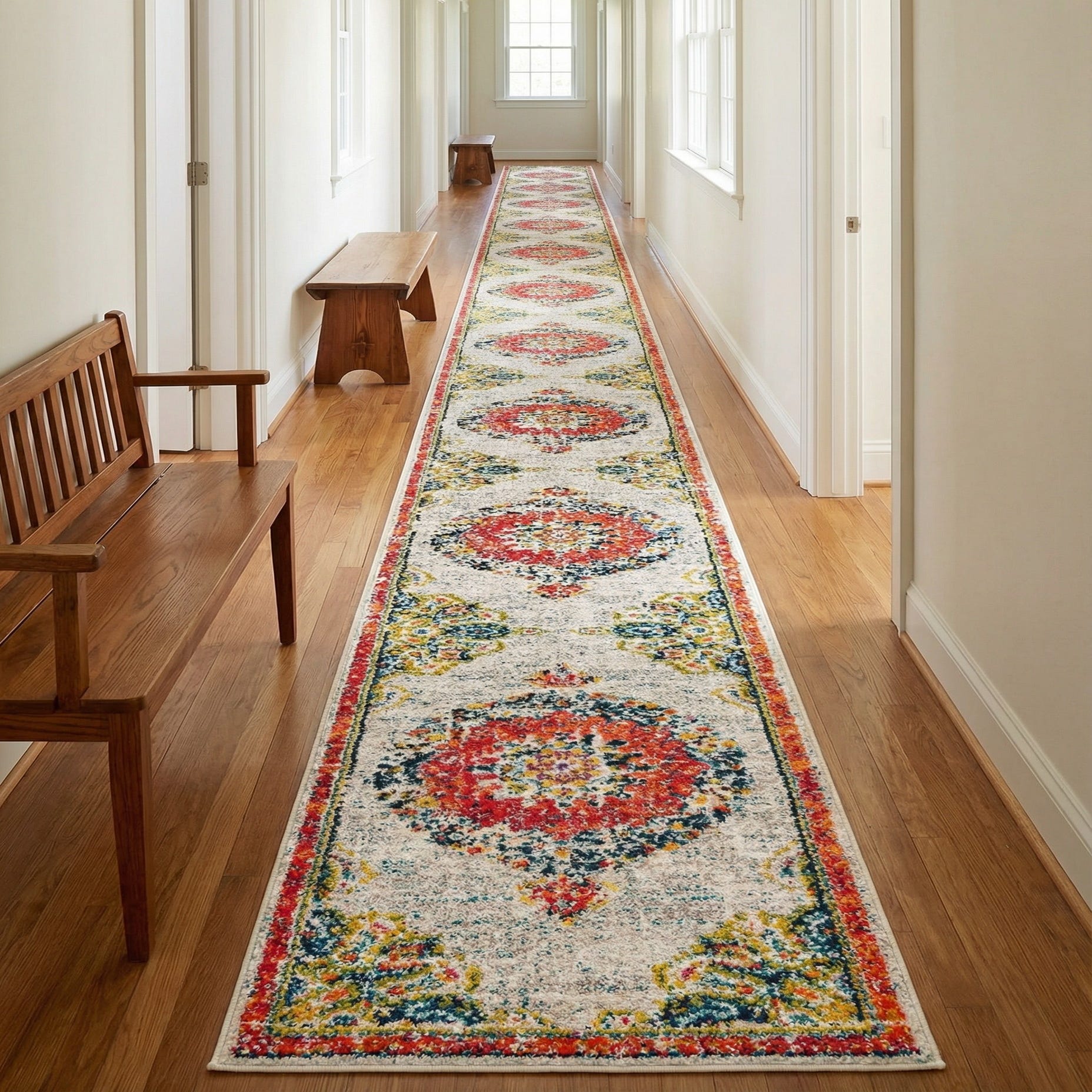This runner presents a traditional medallion layout set on an ivory field, with three repeating round medallions in warm red-orange framed by deep navy and black accents. Flecks of blue, gold, green, pink and orange are woven into the design, giving the pattern a lively, multicolored look while the narrow border ties the composition together. The finish is intentionally distressed, creating a gently weathered appearance that softens the motifs and highlights the low-to-medium pile texture. Machine-made from 100% polypropylene, the rug has a smooth, slightly cushioned hand that still reads durable underfoot.