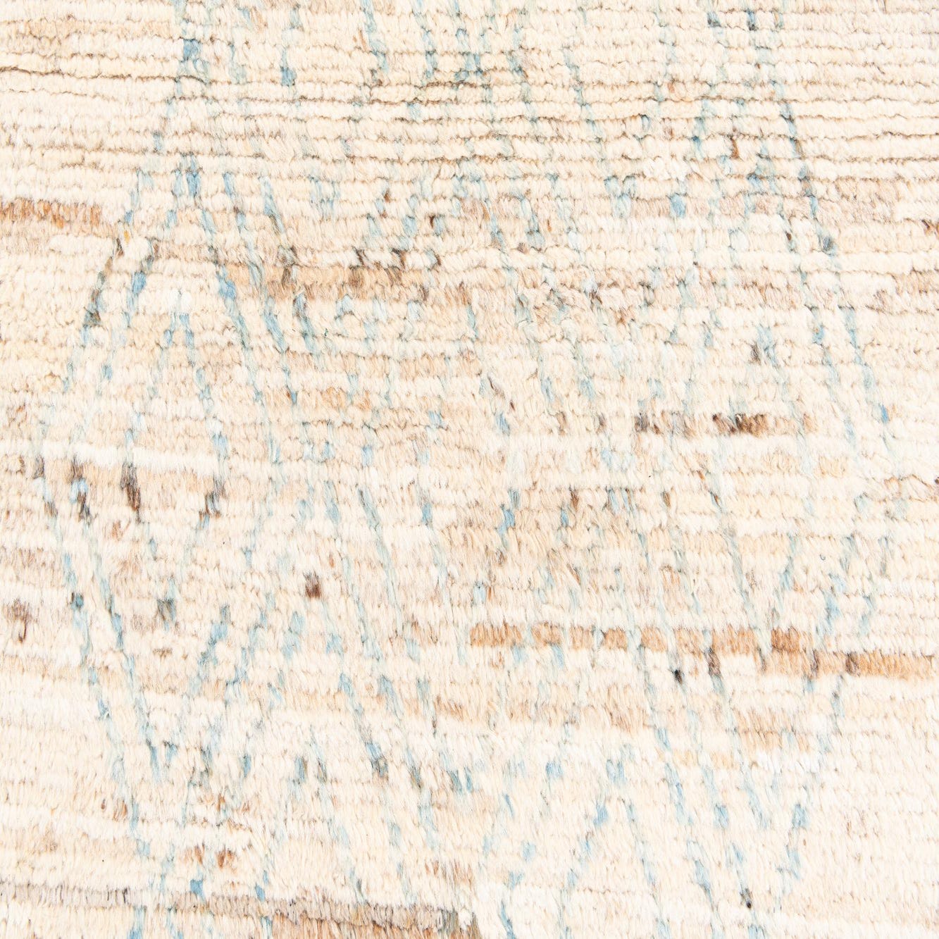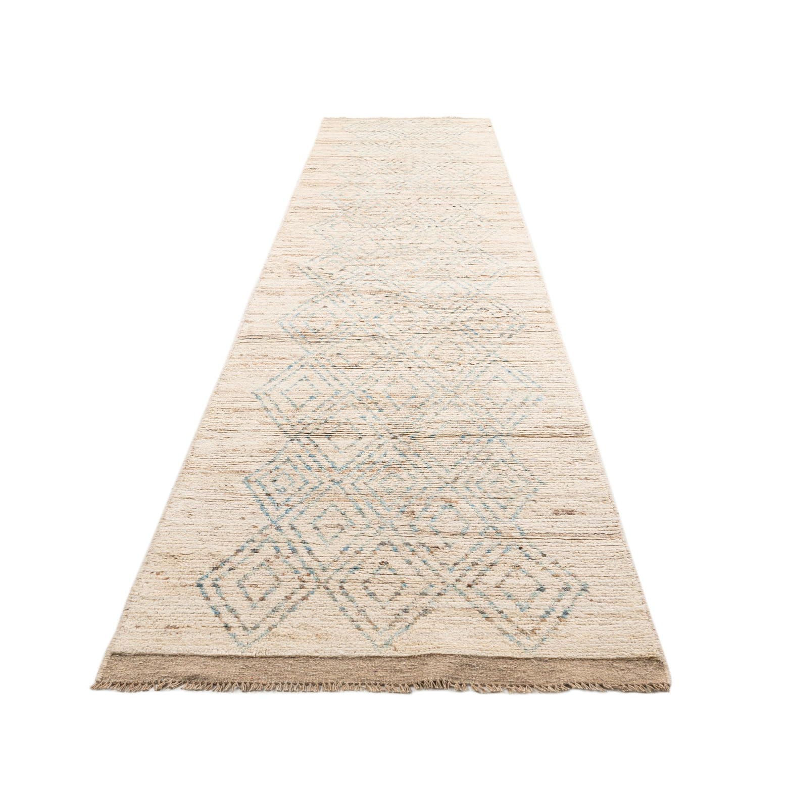 A 16 ft ivory wool runner rug with a tribal diamond pattern in light blue and brown, ideal for a hallway.