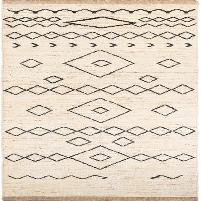 Primary color is Ivory. Colors in this rug include: Ivory, Black, Brown.
