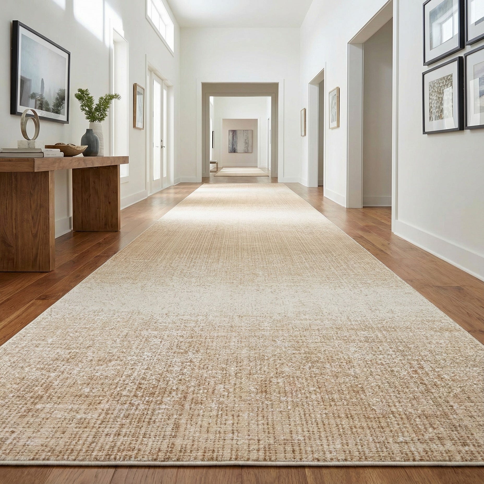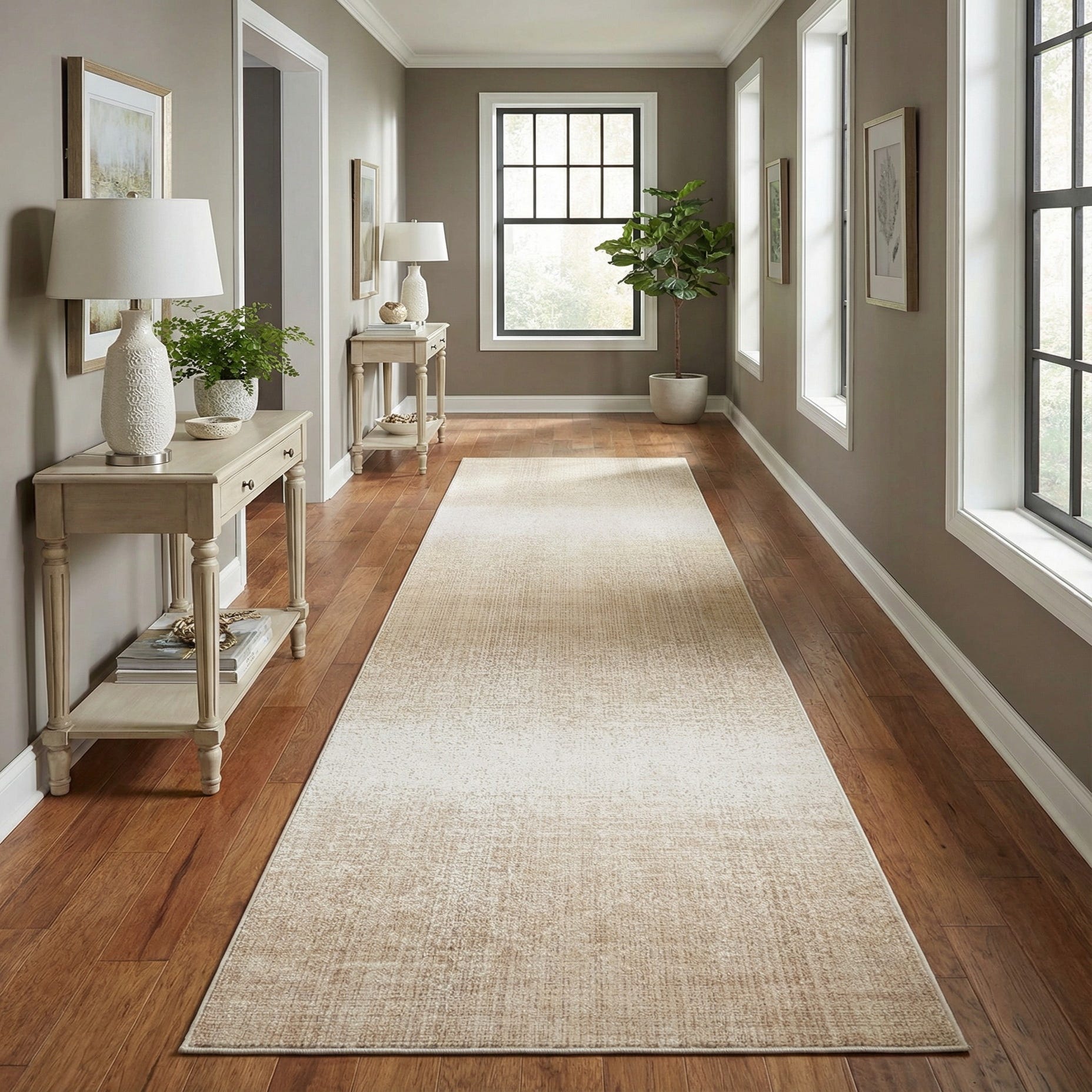 A 20 ft runner rug in shades of ivory and cream, featuring a subtle textured pattern, ideal for a hallway.