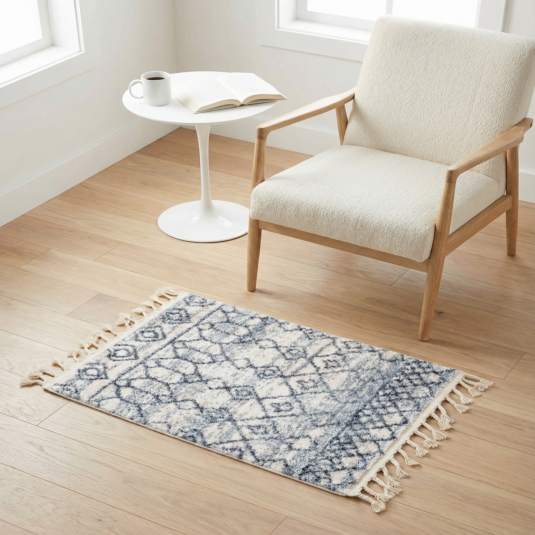 This rug works well in casual, modern farmhouse, Scandinavian, or bohemian rooms where a light, airy foundation is desired. Place it at an entry, beside a bed, in a small seating nook, or layered over a larger rug to add texture and visual interest. Pair with light wood furniture, linen textiles, and matte metal accents to emphasize the soft contrast between the ivory background and gray pattern.