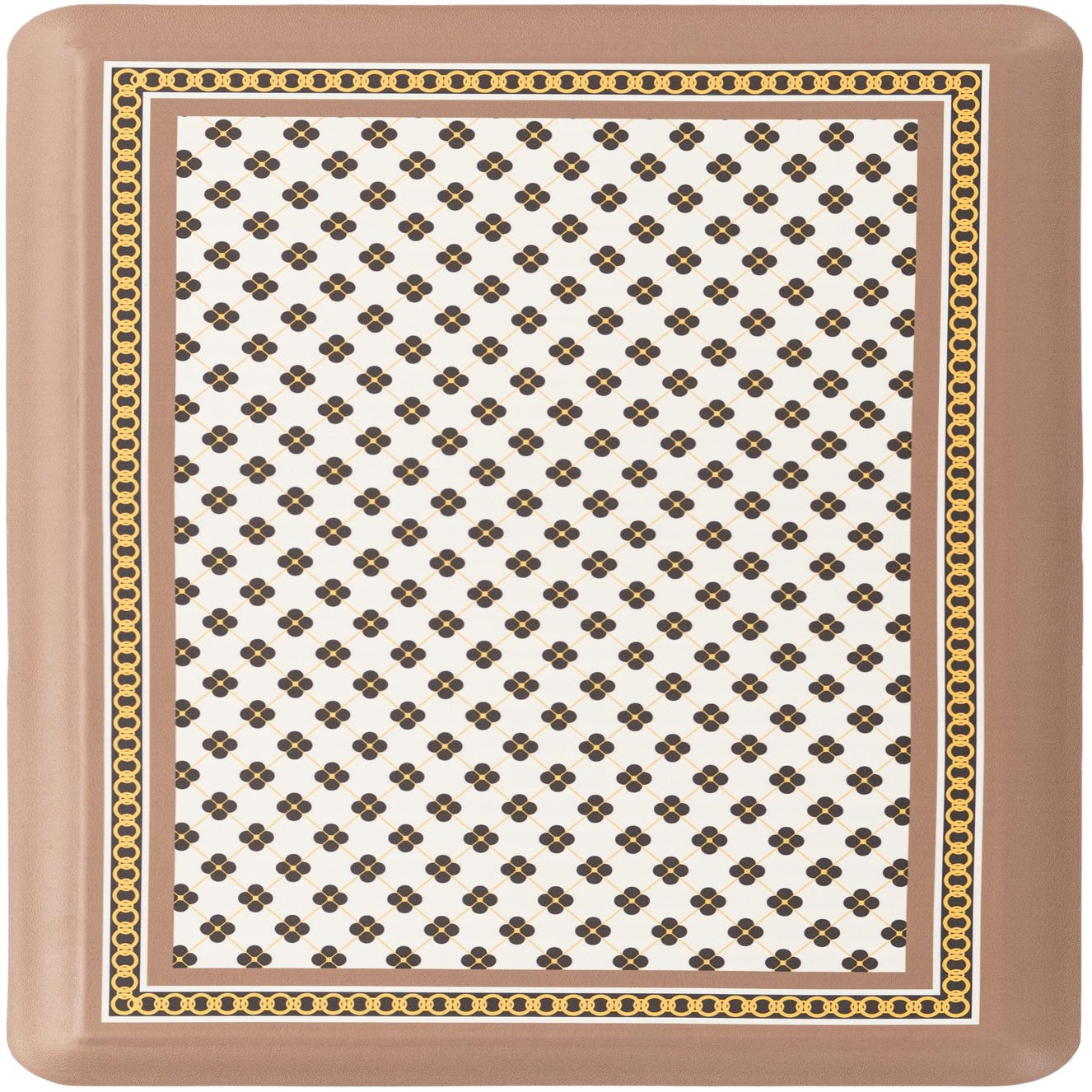 A rectangular ivory and brown rug with a repeating dark floral pattern and a gold chain border design.
