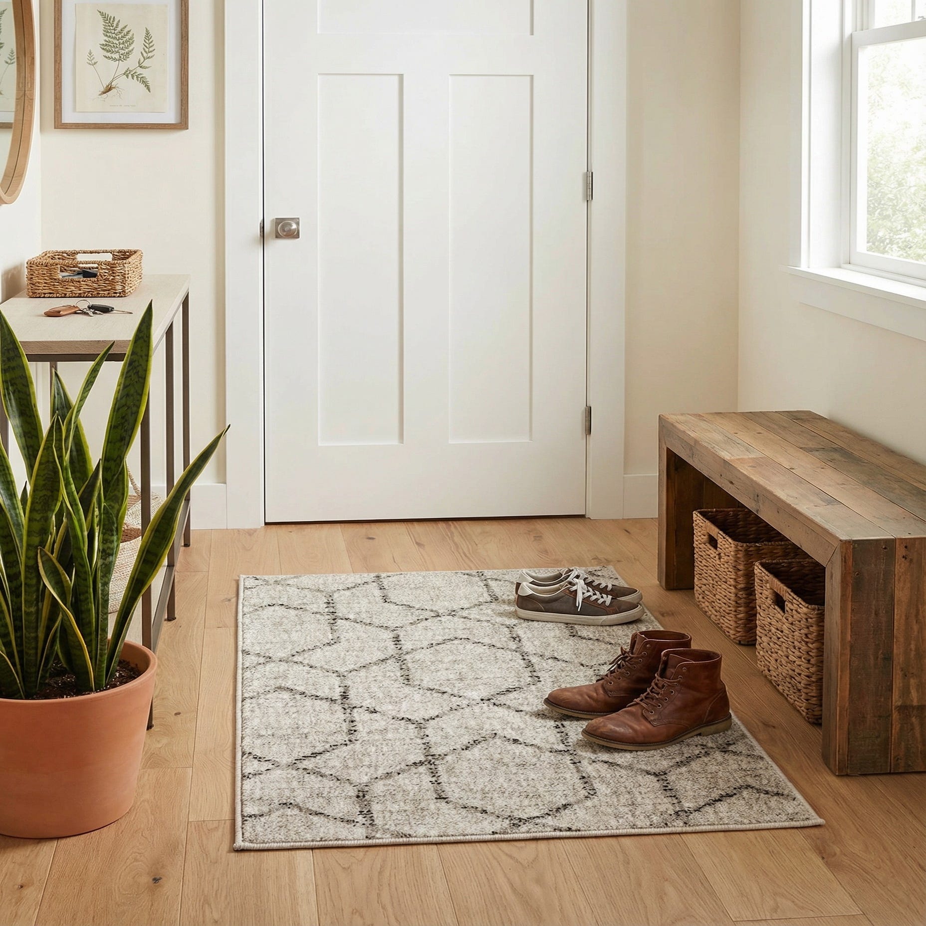 Machine-made of 100% recycled space-dyed polyester, this piece offers consistent construction and a soft, low-slung pile that fits easily under furniture or in high-traffic zones. Its neutral palette and casual geometric pattern work well in contemporary and transitional settings—try it in an entryway, layered beneath a small seating group, or placed by a bedside. It also pairs nicely with Scandinavian, minimalist, or modern farmhouse décor schemes where a subtle, textural anchor is needed.