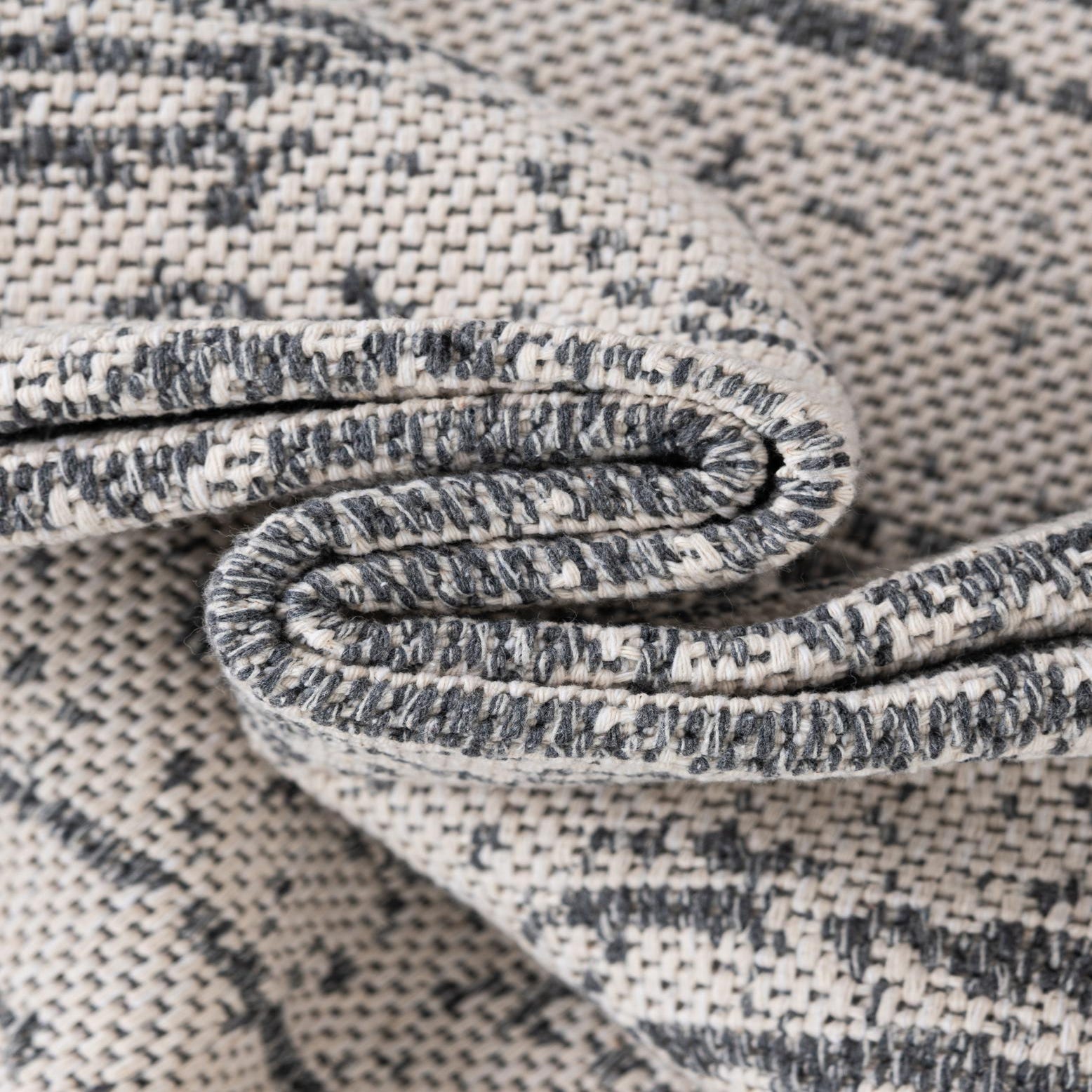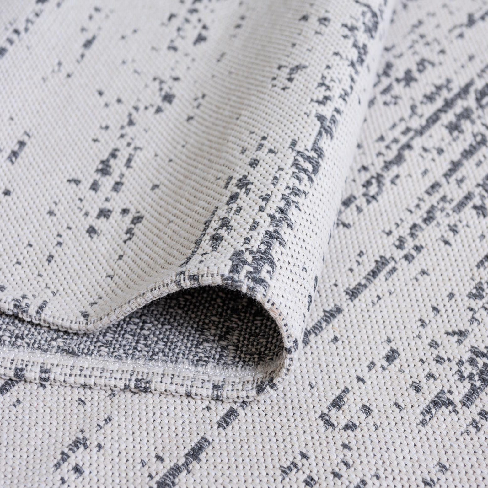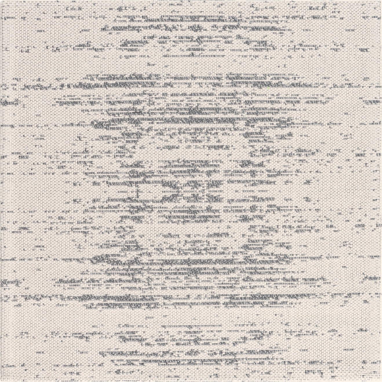 A soft, low-profile flatweave in 100% cotton, this machine-made rug pairs an ivory ground with an understated gray, distressed motif. The design centers on an abstract medallion formed from horizontal striations and scattered flecks, giving the surface a gently worn, layered look. The woven cotton surface has a tactile, cloth-like hand and a crisp texture that sits comfortably underfoot while keeping the overall silhouette light and airy.