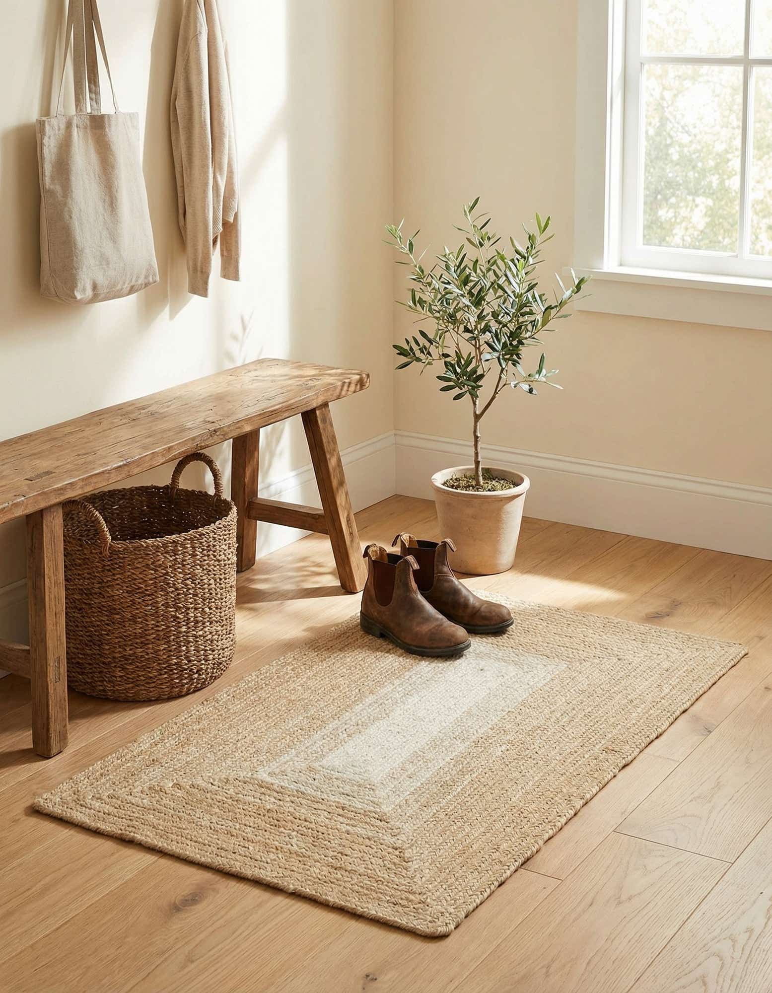 A 2x3 rectangular hand-braided wool rug with a modern design, featuring a natural ivory border fading to a lighter cream center.