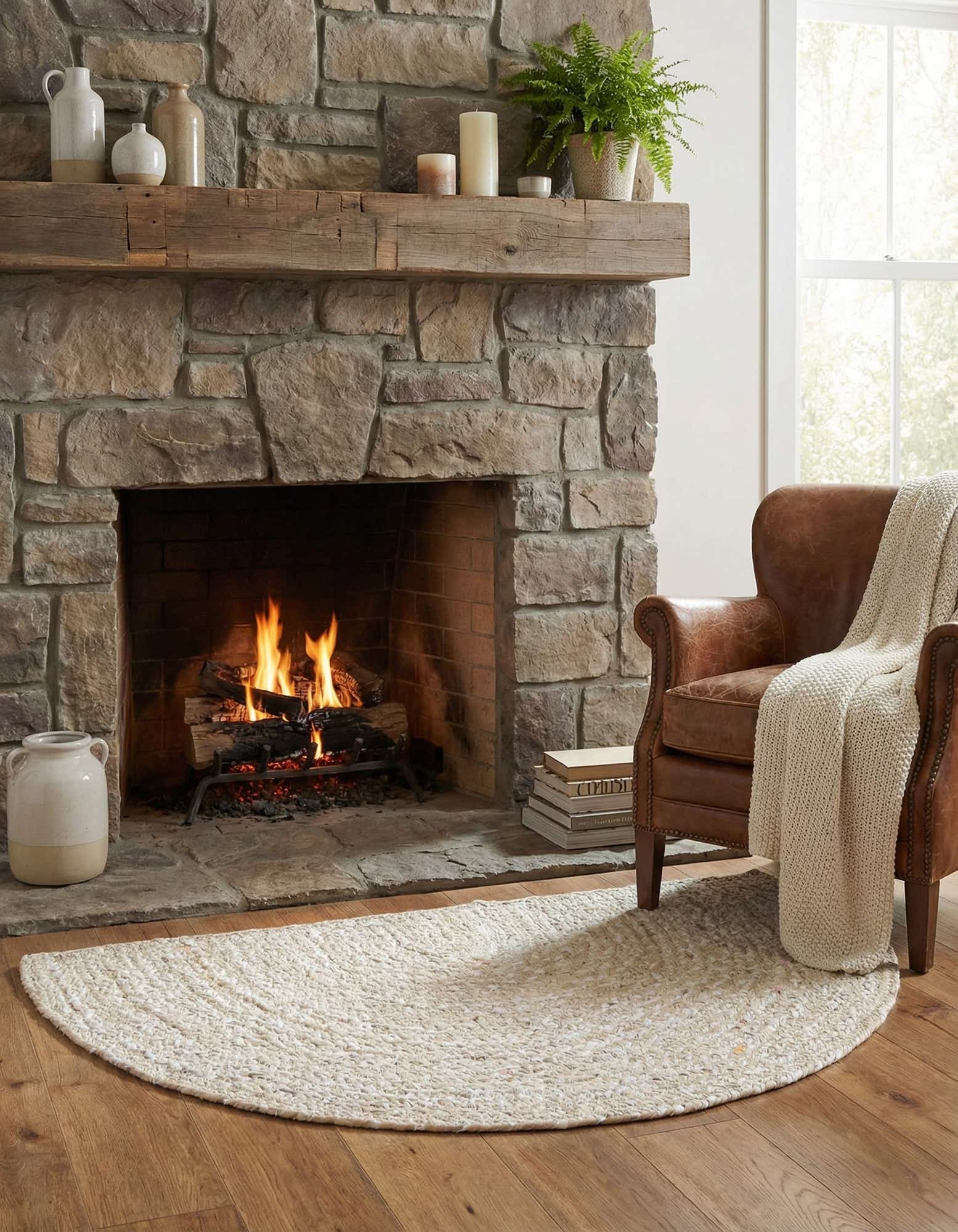 A 2' 2 x 3' 7 ivory braided cotton hearth rug with a semicircular shape and subtle flecks of color.