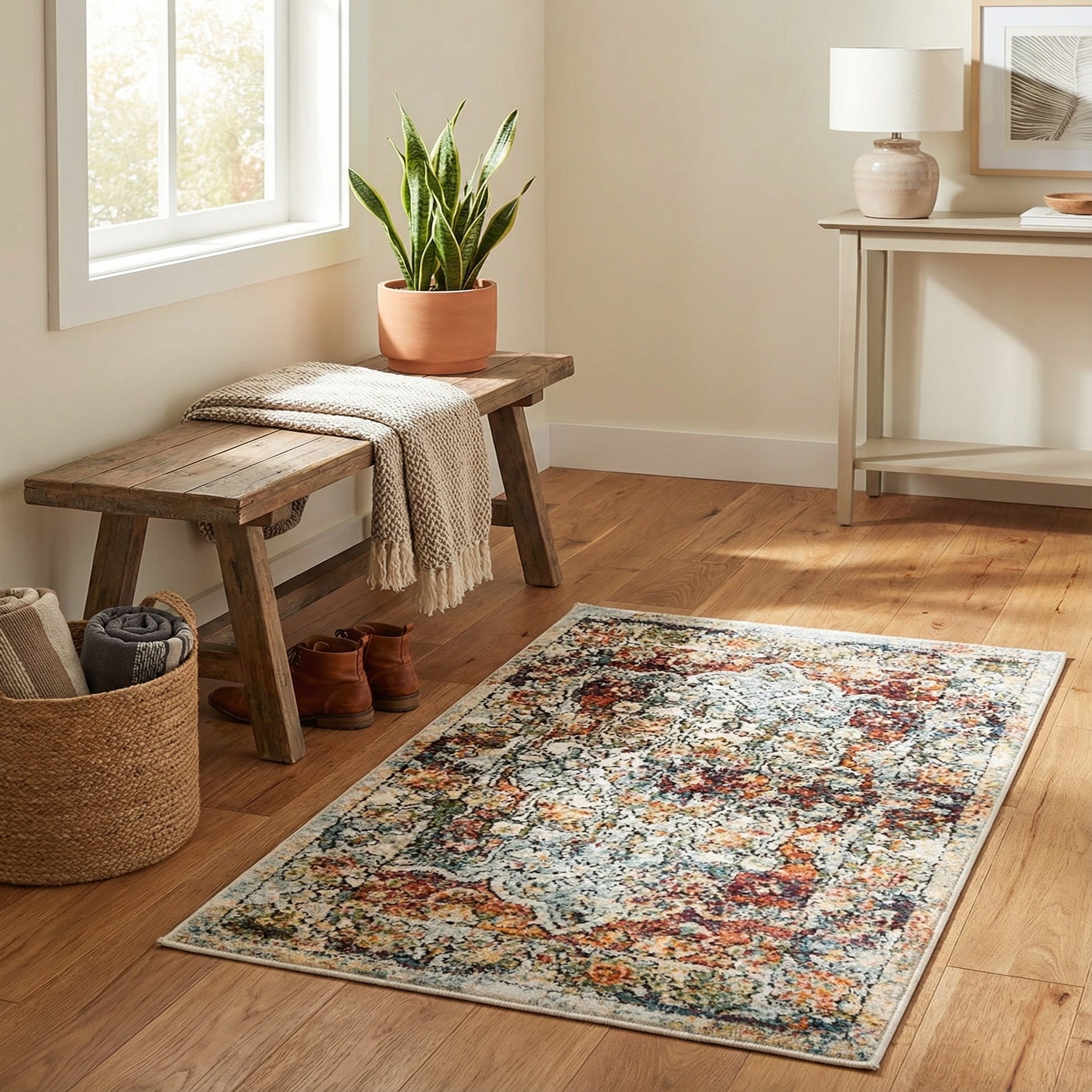 Machine made from polypropylene and polyester, the pile has a pleasant, slightly cushioned hand that invites bare feet while maintaining a low profile for easy furniture placement. This size works well beside a bed, at an entry or layered in a seating vignette to add color and texture without overwhelming the room. Pair it with warm wood tones and neutral upholstery for a casual transitional look, or let it enliven an eclectic or bohemian scheme with patterned pillows and mixed metals.