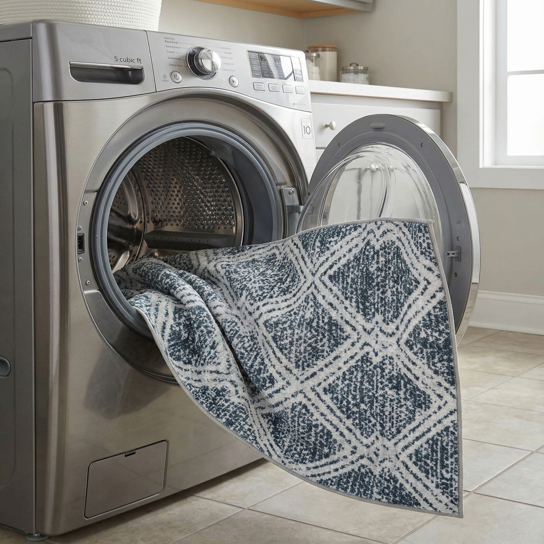 This piece works well in a range of interiors — pair it with coastal or modern farmhouse palettes to enhance light, breezy spaces, or use it in transitional and contemporary rooms to add a quiet geometric anchor. Its compact footprint is ideal for small entryways, in front of a sink, beside a bed, or layered over a larger neutral rug to introduce pattern and color without overwhelming the room.
