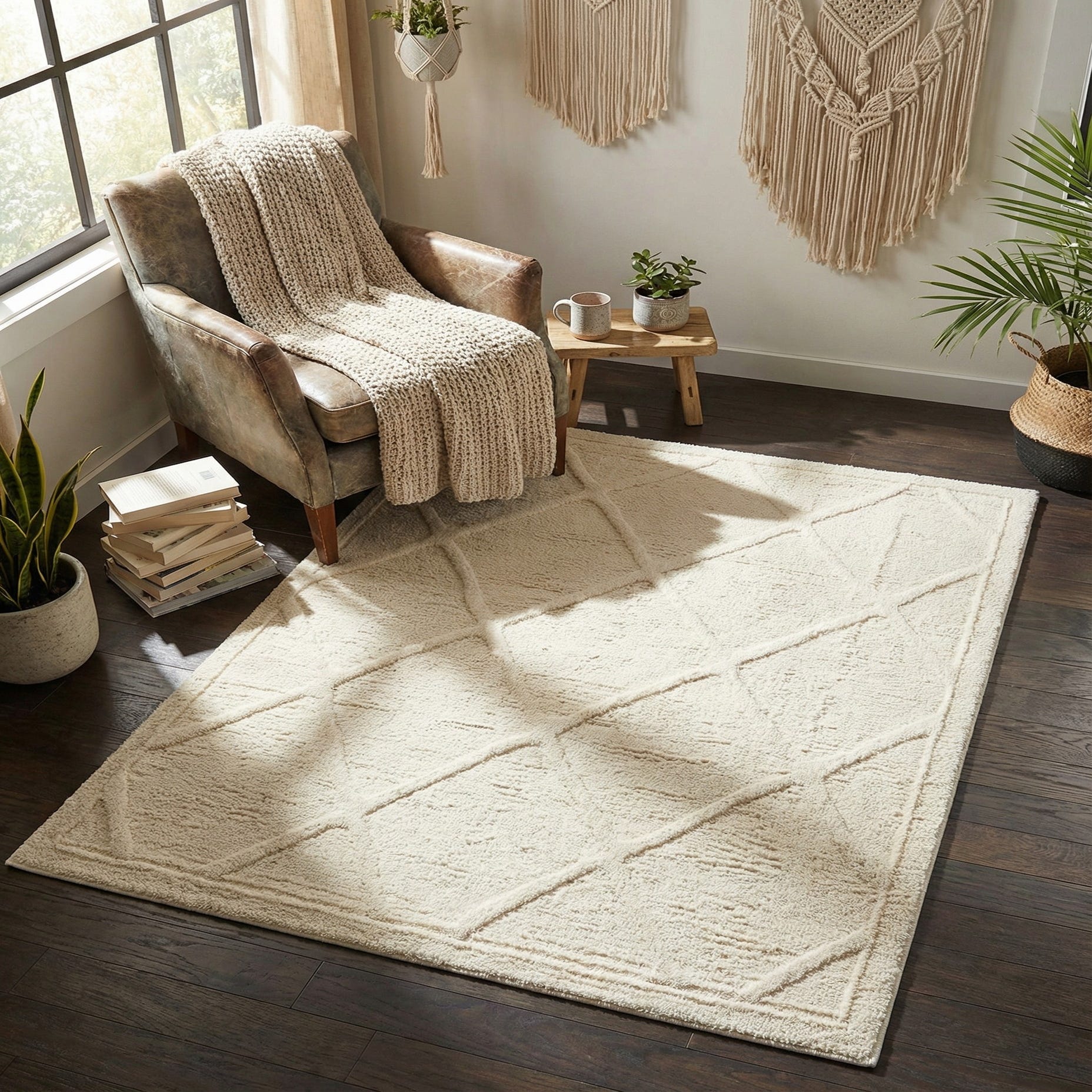 This rug fits naturally into modern, Scandinavian, or transitional interiors, where its neutral ivory color and understated geometric pattern add quiet structure. Use it beside a bed, in a cozy reading corner, at the foot of a sofa, or layered over a larger rug to soften a seating area. Its clean look pairs well with light wood, muted textiles, and minimalist decor, bringing warmth and tactile contrast to compact spaces.