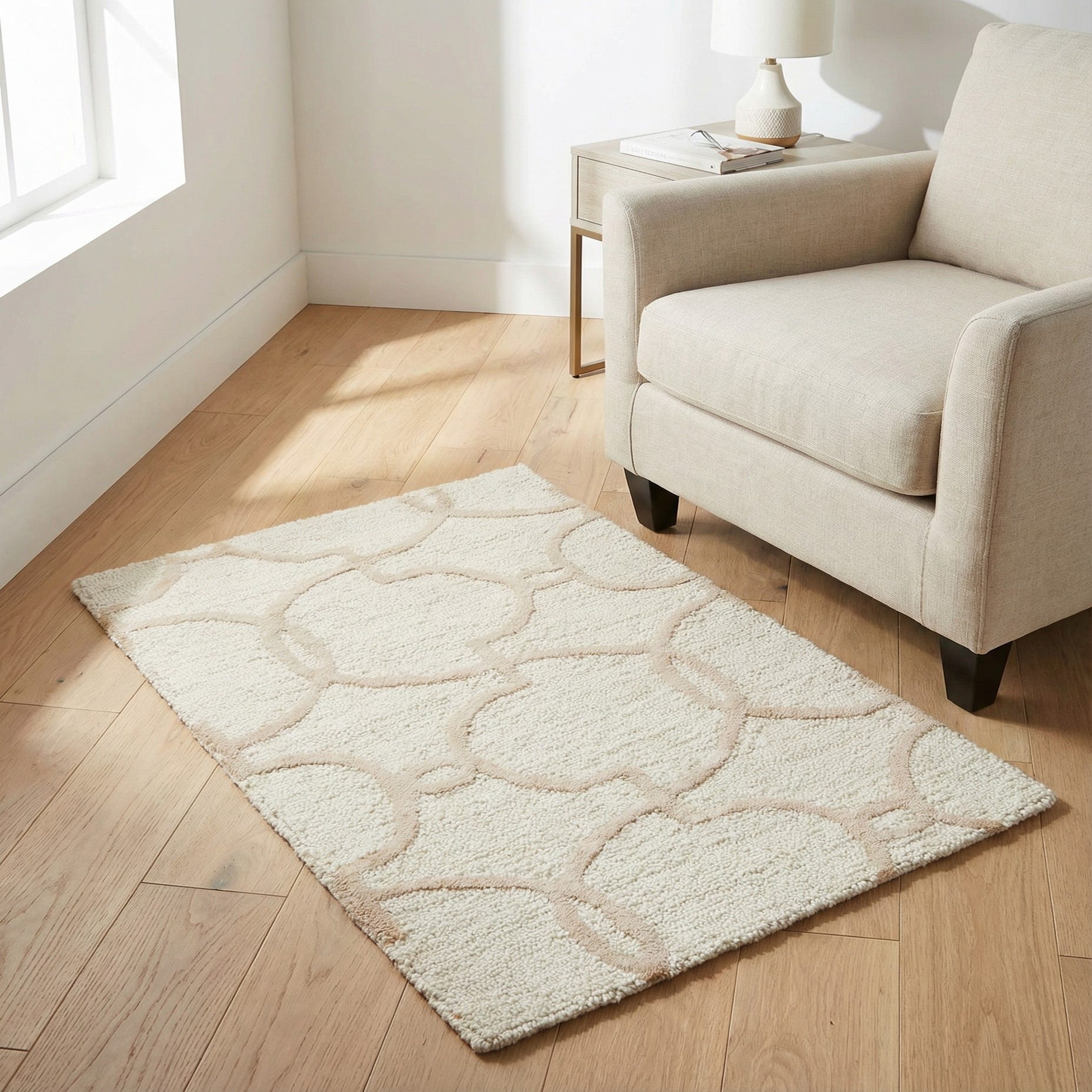 The Luna Collection offers a refined rug hand-tufted of a wool and cotton blend, providing a luxurious feel underfoot. This piece, measuring 2x3 feet, exhibits a tasteful geometric pattern composed of interlocking shapes, outlined in a soft brown against an inviting ivory background. The contrast in color is subtle, yet enough to add visual interest without overwhelming the space.