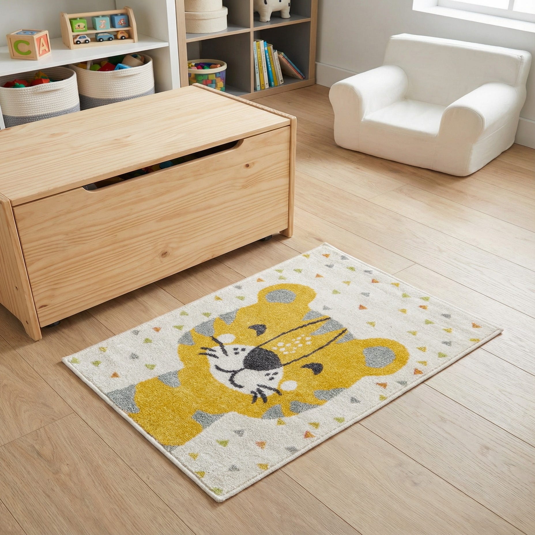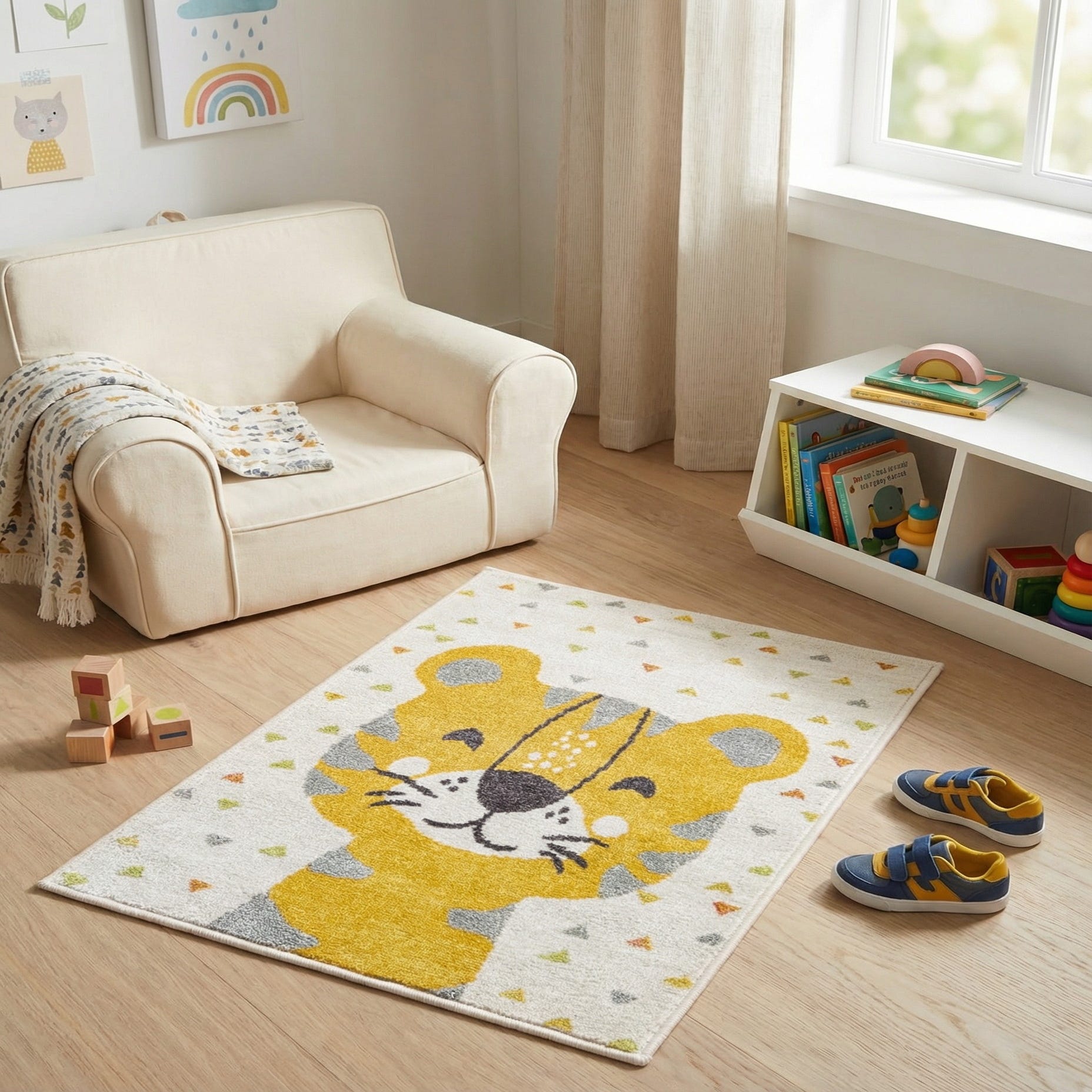 A cheerful, kid-friendly rug rendered in warm yellow and soft gray pops against an ivory field. The design centers on a large, smiling tiger face with simple, cartoon-like features and subtle stripe details, while tiny scattered triangle accents in green, yellow and gray add playful movement across the background. Machine-made from 100% polypropylene, the rug has a low, soft pile that feels cushioned underfoot and shows the color contrasts clearly without heavy texture variation.