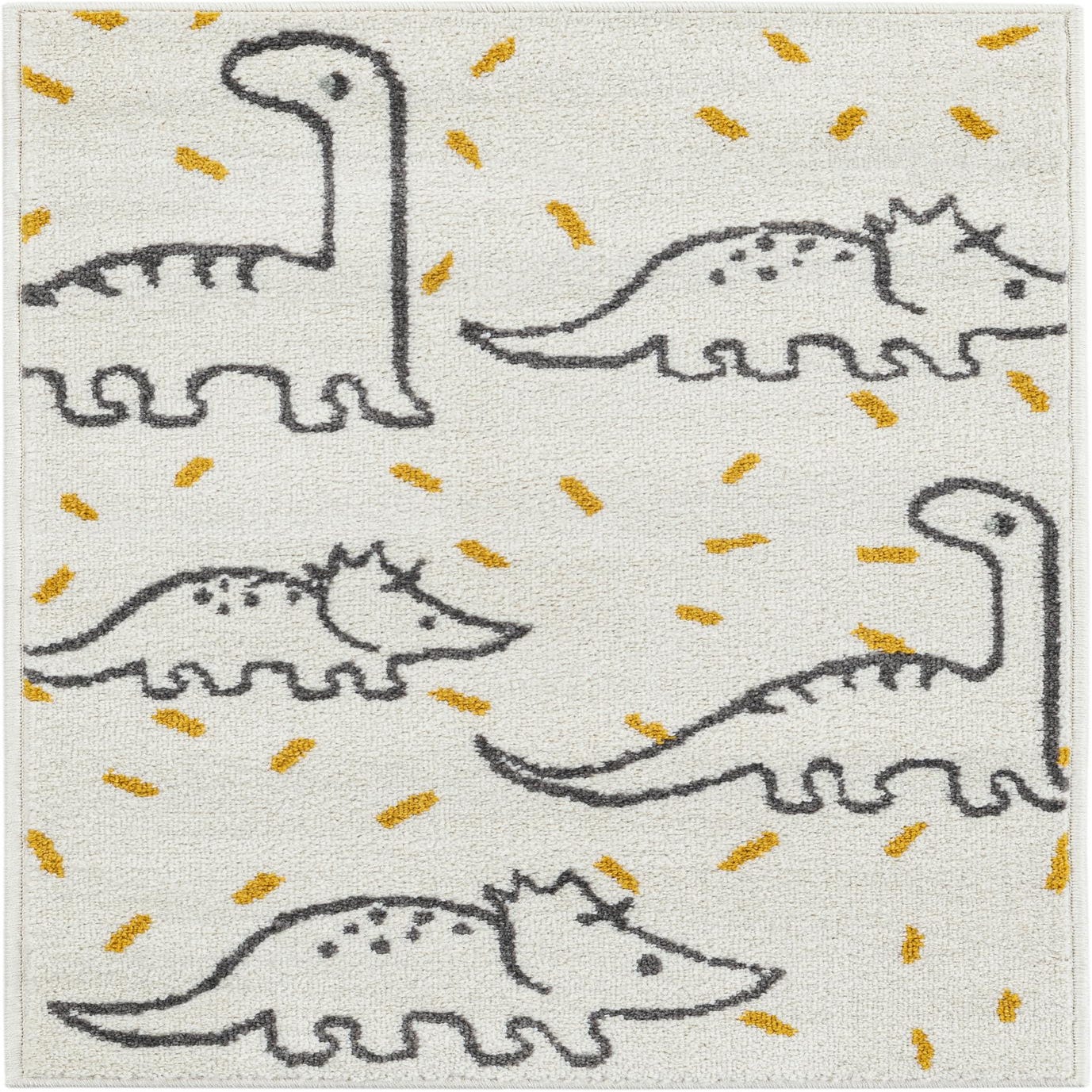 A 2x3 rectangular ivory rug with playful dark gray outlined dinosaurs and scattered yellow dashes, perfect for a child's room.
