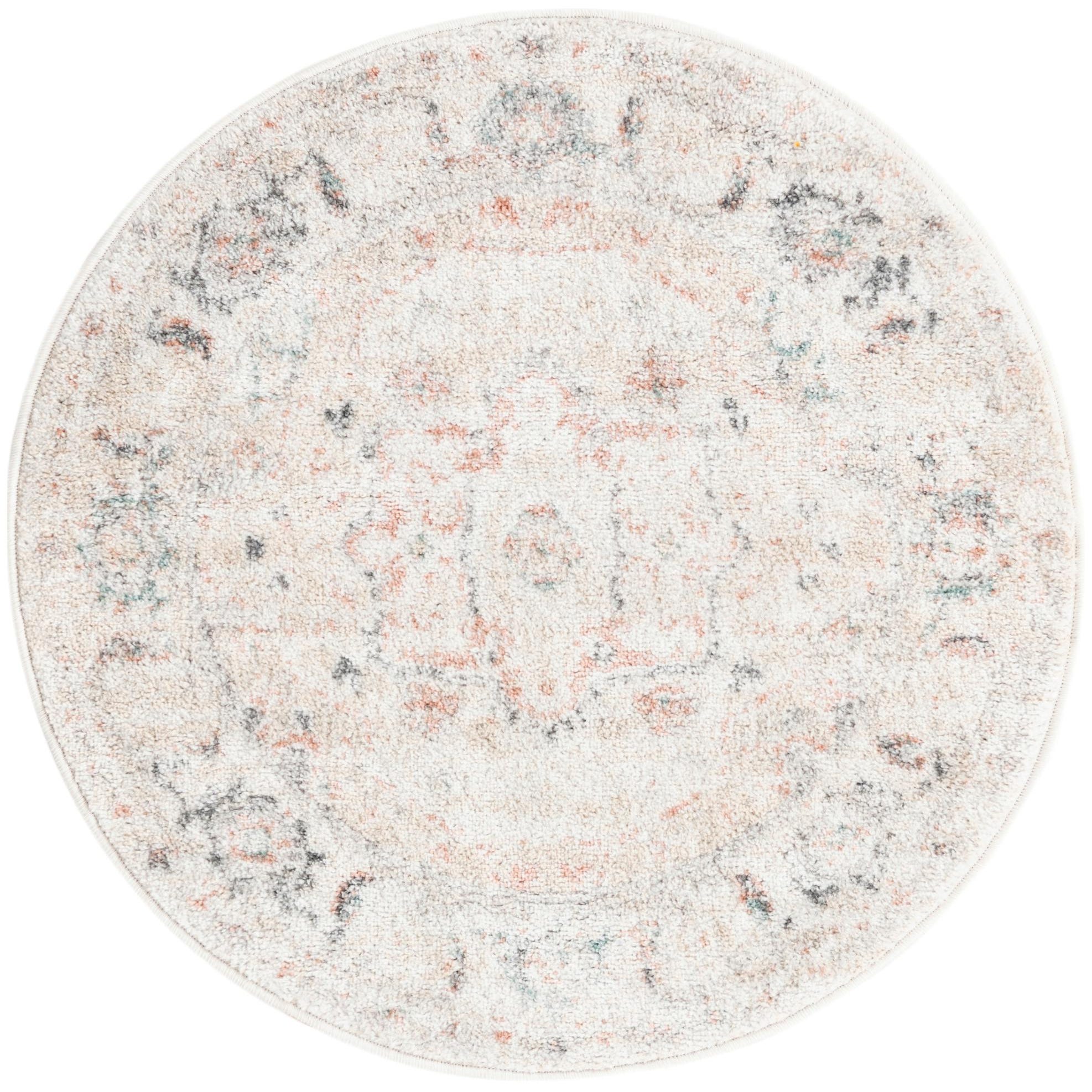 A soft, vintage-inspired medallion rests on an ivory field, its worn motifs rendered in muted gray and blush pink. The pattern is gently distressed, with faded floral and scroll details that create an airy, well-loved look without heavy contrast. The round shape emphasizes the central medallion and gives the design a gentle, balanced presence in the room.