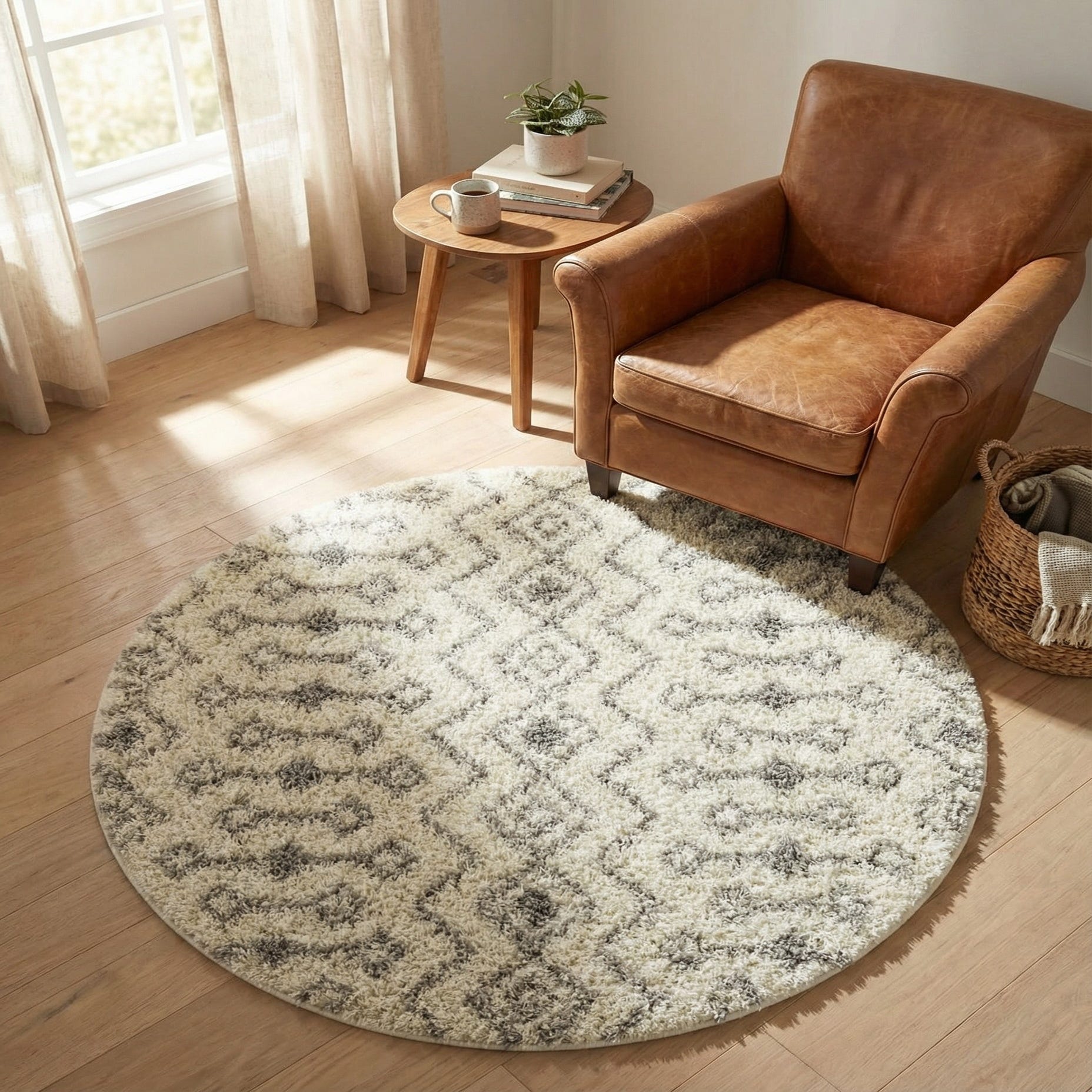 Soft underfoot with a casual, lived-in look, this round shag rug pairs an ivory field with a gray Moroccan trellis pattern. The repeating diamond and curvilinear lattice create a gentle geometric rhythm across the surface, while the high-pile polypropylene fibers add depth and a slightly shaggy hand. Machine-made from 100% polypropylene, the construction gives the pile a plush, cushiony feel and a subtle two-tone effect where the gray motif rises against the creamy ivory background.
