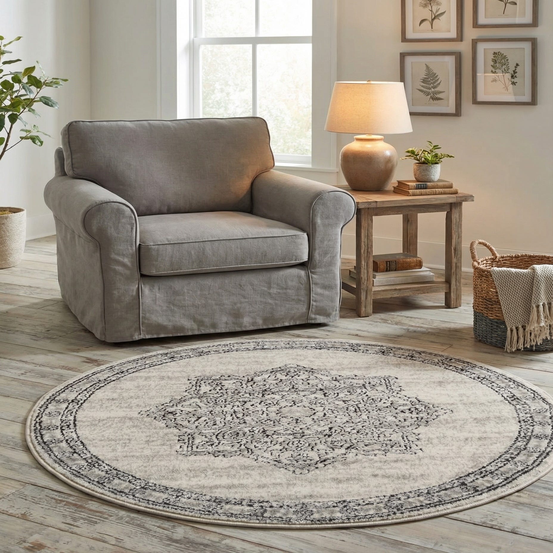 A round ivory and cream rug with a distressed black medallion pattern and matching ornate border.