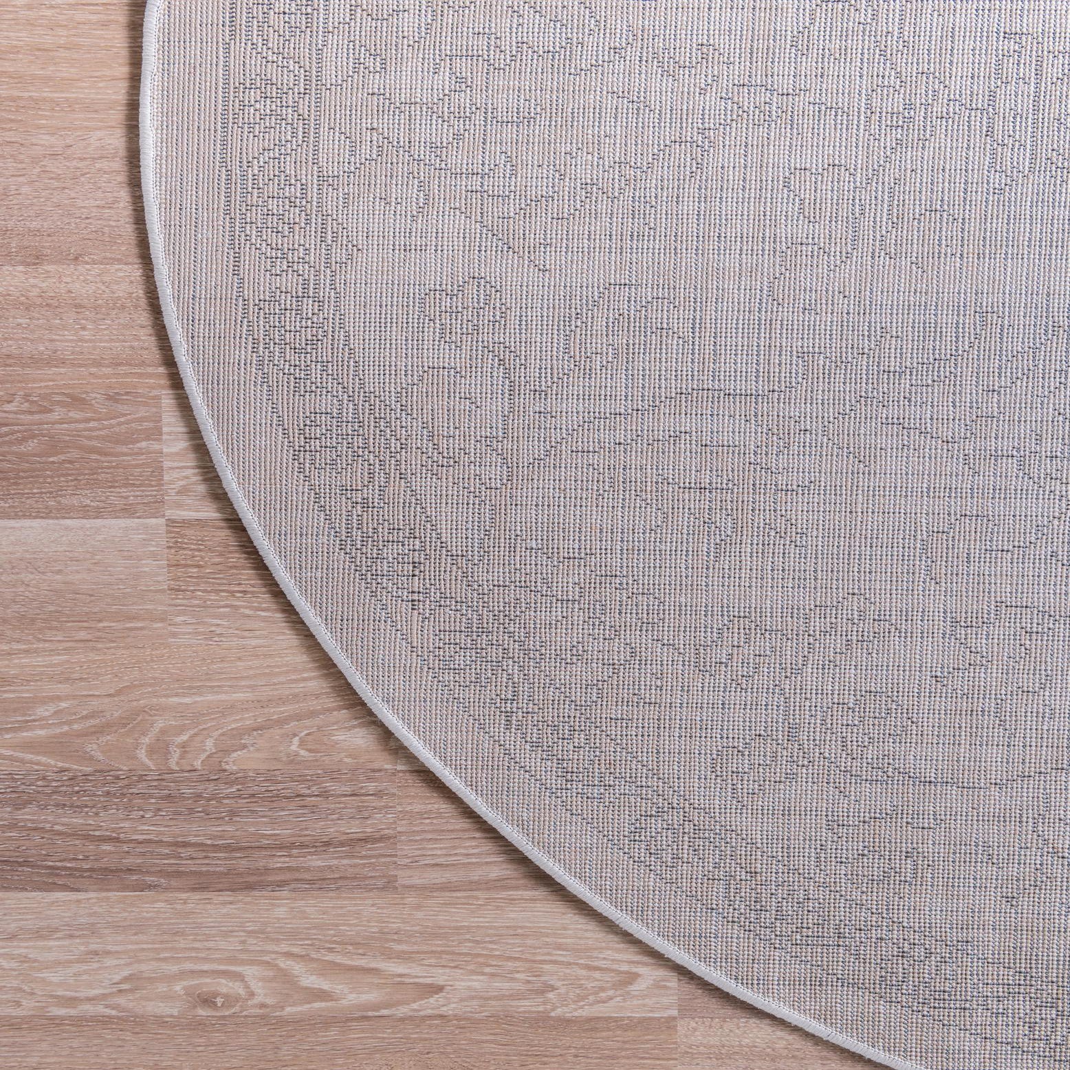 This round shape works well under a small dining or bistro table, in an entry or foyer, or layered beneath a reading chair to create a cozy corner. It pairs naturally with warm wood tones and linen upholstery for a relaxed farmhouse or coastal look, and also complements transitional and traditional settings when combined with gray accents and matte metal details.