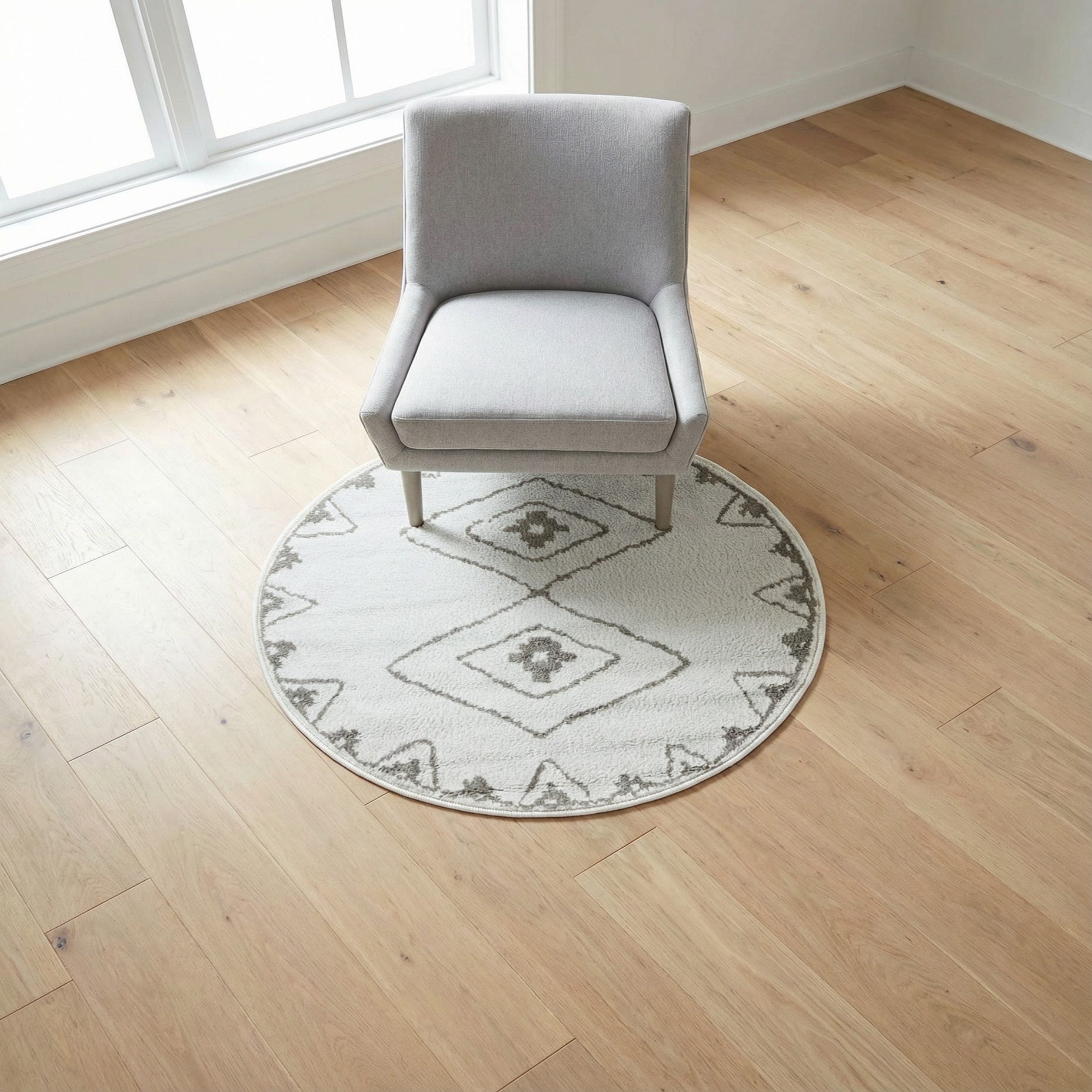 This round design fits naturally into casual and contemporary spaces—place it beneath a small bistro table, in a cozy reading nook, or at the foot of a bed to introduce pattern without overwhelming the room. Pair it with light woods, linen upholstery, and matte metal finishes for a Scandinavian-inspired look, or layer it over warm hardwood and natural fibers for a relaxed, modern-tribal feel.