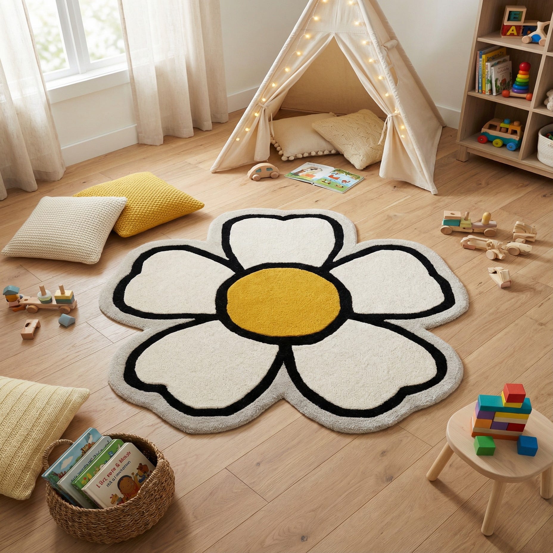 A playful flower silhouette rendered in ivory petals and a warm yellow center, this hand-tufted rug uses bold black outlines and a soft gray trim to create a clean, graphic look. The hand-tufted construction with 80% wool and 20% cotton produces a plush, slightly sculpted surface you can feel beneath your feet: the wool pile offers a warm, resilient hand while the cotton adds structure to the backing and edges.