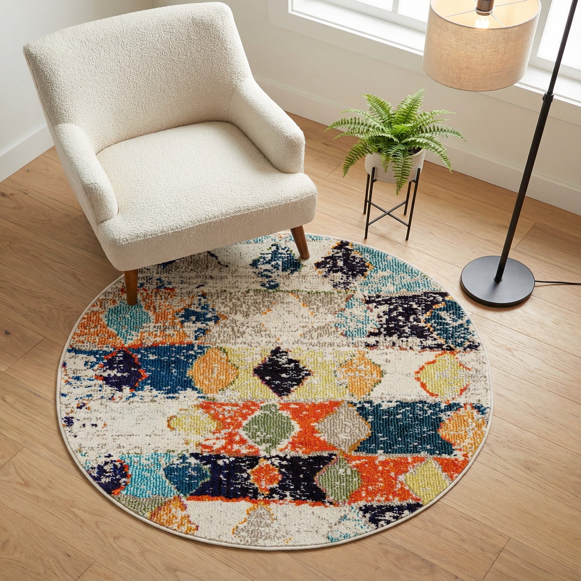 A lively round rug with an ivory background, this piece combines geometric and distressed motifs in a casual, modern pattern. Rows of diamond and hourglass shapes alternate with painterly blocks and worn-in speckles, bringing together navy blue, blue, black, gray, green, orange, yellow and purple against neutral ivory and taupe accents. Machine-made from 100% polypropylene, the low-pile surface has a slightly textured feel—smooth underfoot with enough dimension to read well beneath furniture without adding bulk.