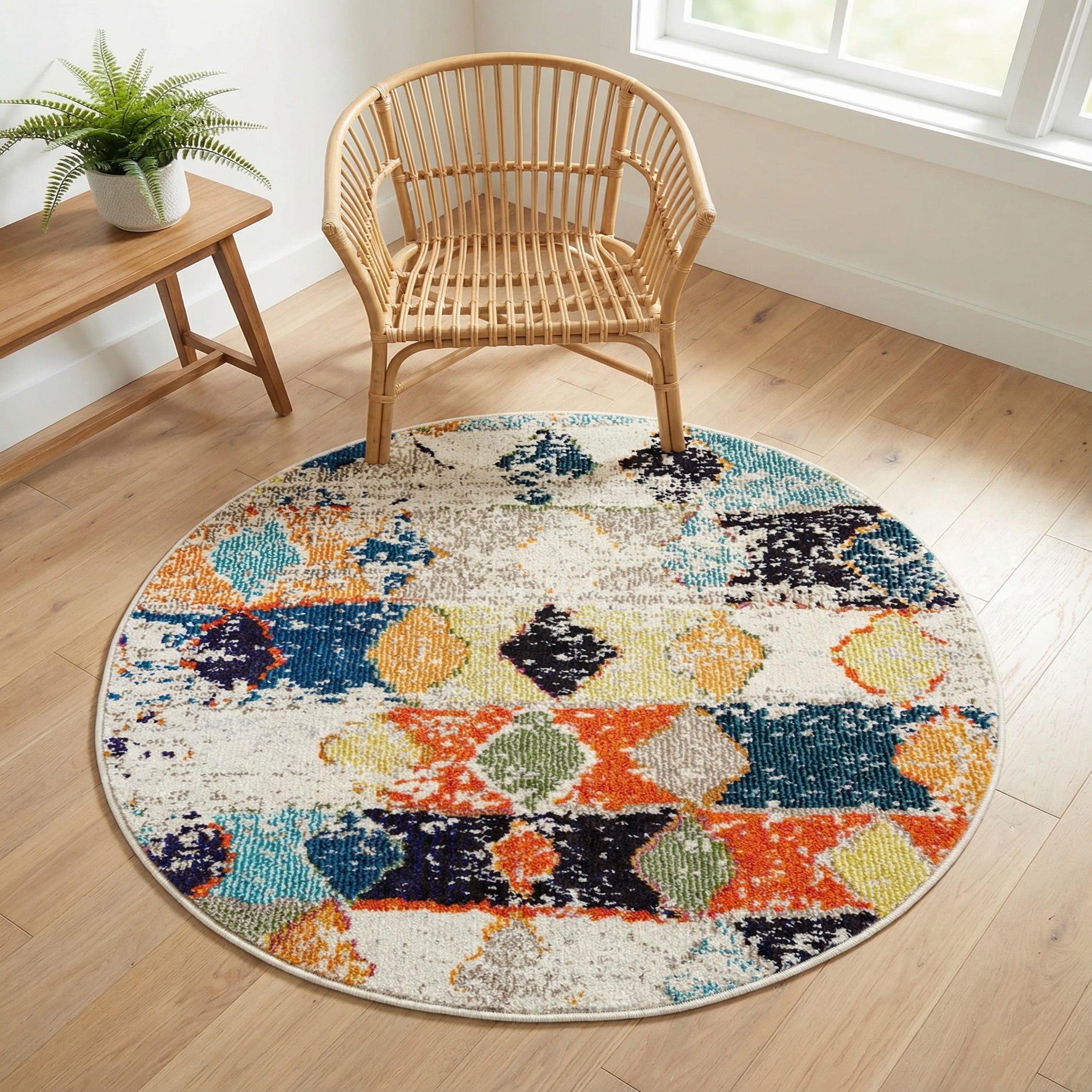 Use this rug to bring color and pattern into compact spaces: it fits naturally under a small dining set or bistro table, anchors a reading nook or entry, and layers nicely in a playful home office or children’s room. Its mix of bright and neutral tones pairs easily with mid-century modern woods, eclectic boho textiles, or contemporary furnishings where a pop of color is desired without overwhelming the room.