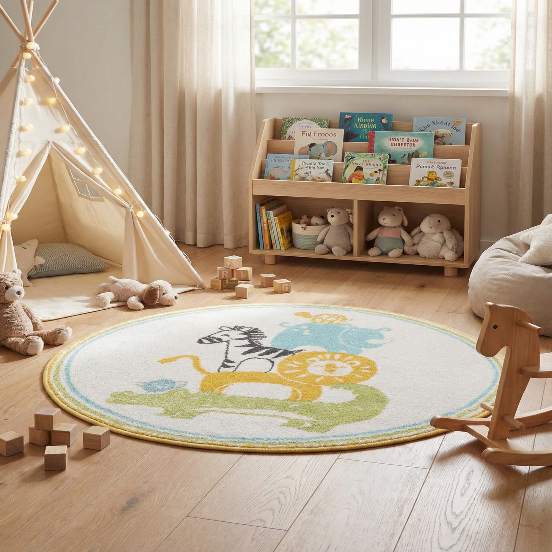 This round piece works well as a focal point in a nursery or playroom, defining a play area or a cozy reading corner. Pair it with natural wood furniture and pastel bedding for a calming atmosphere, or mix in brighter toys and patterned pillows for a lively, kid-focused space. Its shape and color palette also make it a good option for lining up with shelving units, toy chests, or a small cluster of floor cushions.