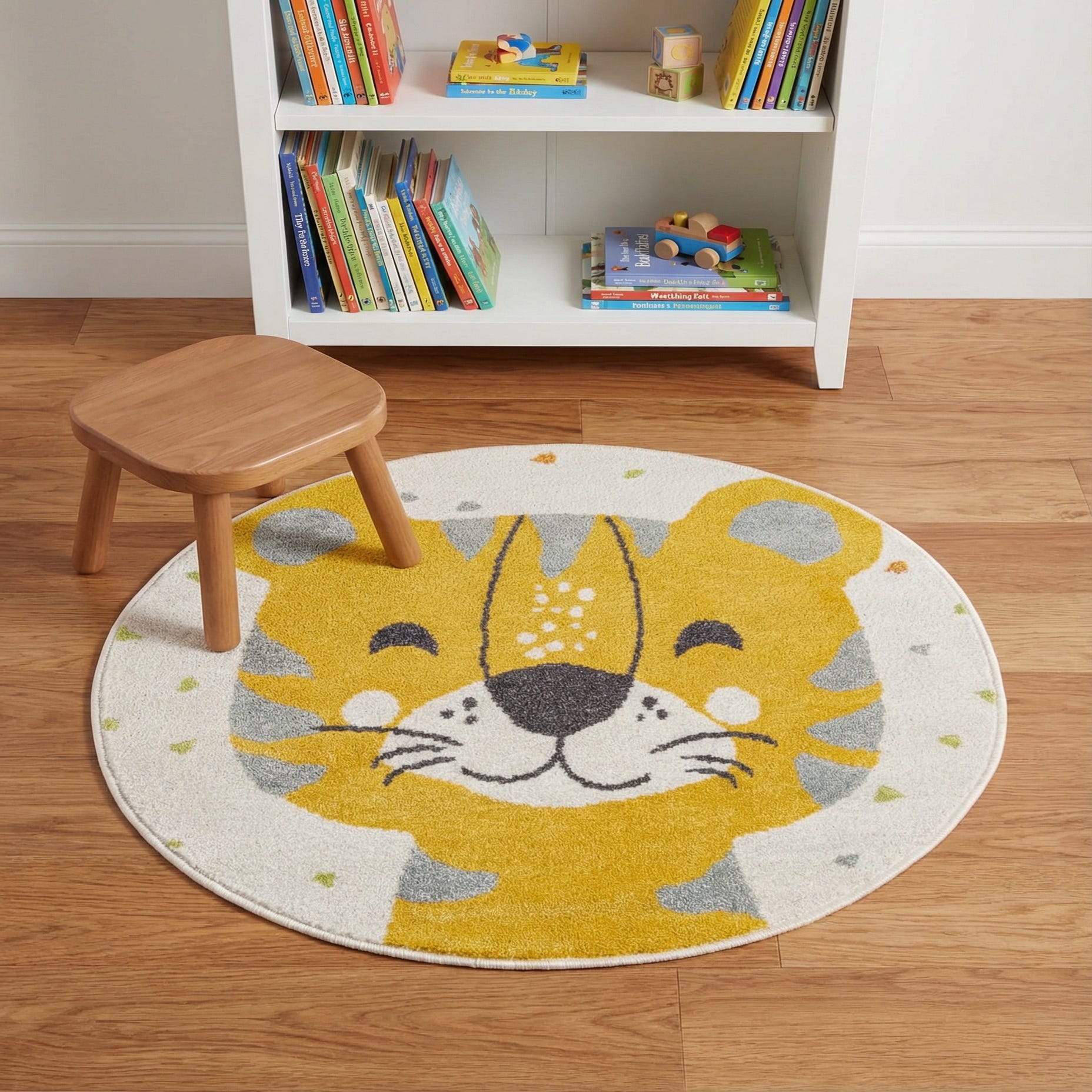 Sized to anchor smaller spaces, this piece works well in a nursery, playroom, reading nook or beside a child’s bed. Pair it with natural wood furnishings, muted gray textiles and pops of mustard or green to echo the rug’s palette; it suits modern, Scandinavian and casual contemporary children’s interiors. The round shape softens room lines and provides a cheerful focal point.