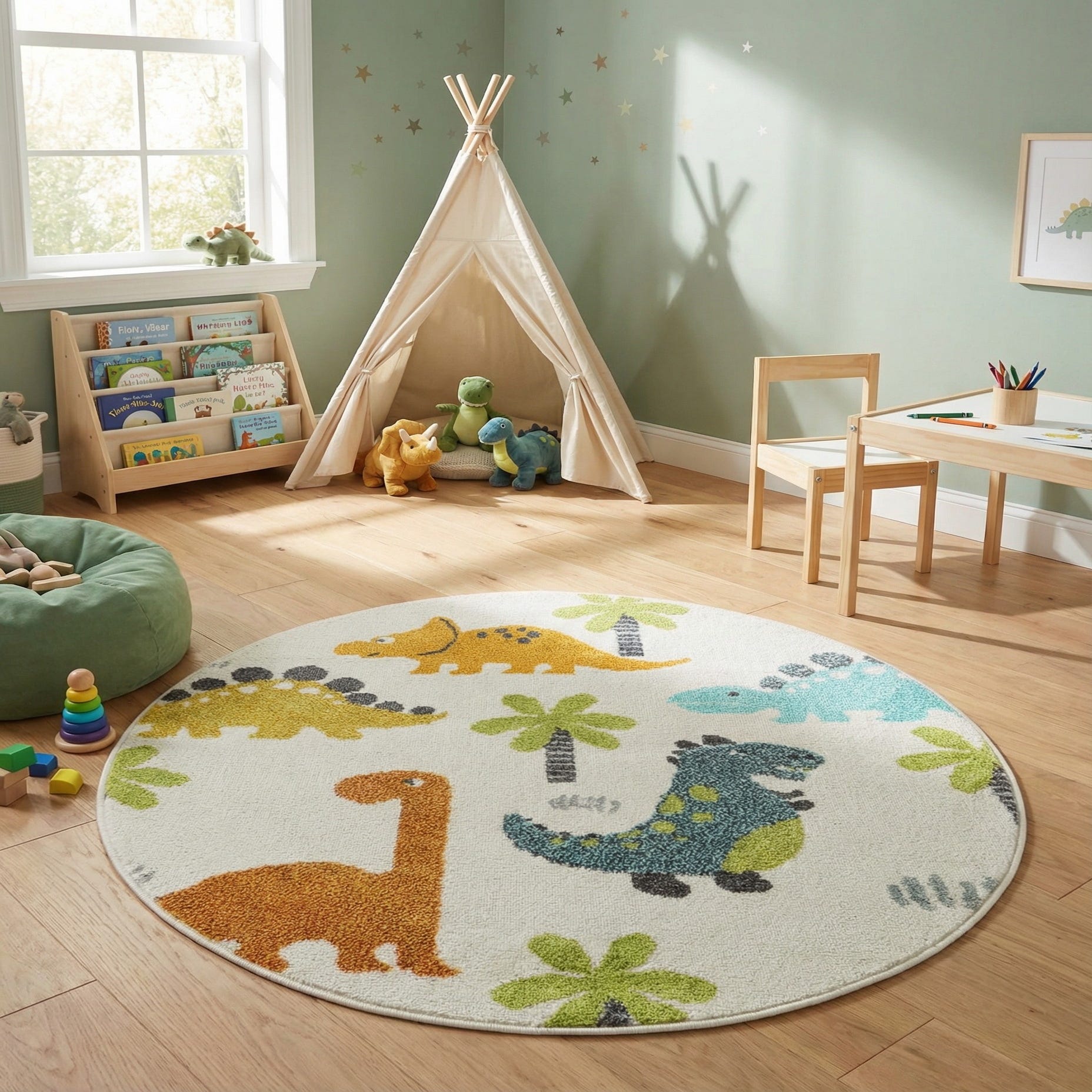 A cheerful circle of playful dinosaurs and palm trees pops against an ivory field, rendered in friendly color-block shapes of blue, yellow, green, red and black. The pattern mixes a variety of dinosaur silhouettes — from long-necked to stegosaurus-style forms — arranged casually so each motif reads clearly without feeling crowded. The surface is made from 100% polypropylene with a low, dense cut pile that feels soft underfoot while holding the defined edges of each colorful shape, giving the rug a tactile, slightly bouncy texture that’s inviting for little ones to sit and play on.