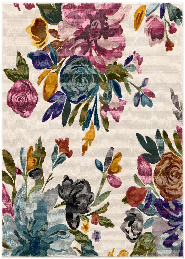 Primary color is Ivory. Colors in this rug include: Ivory, Black, Blue, Gray, Light Blue, Olive, Pink, Yellow, Purple.