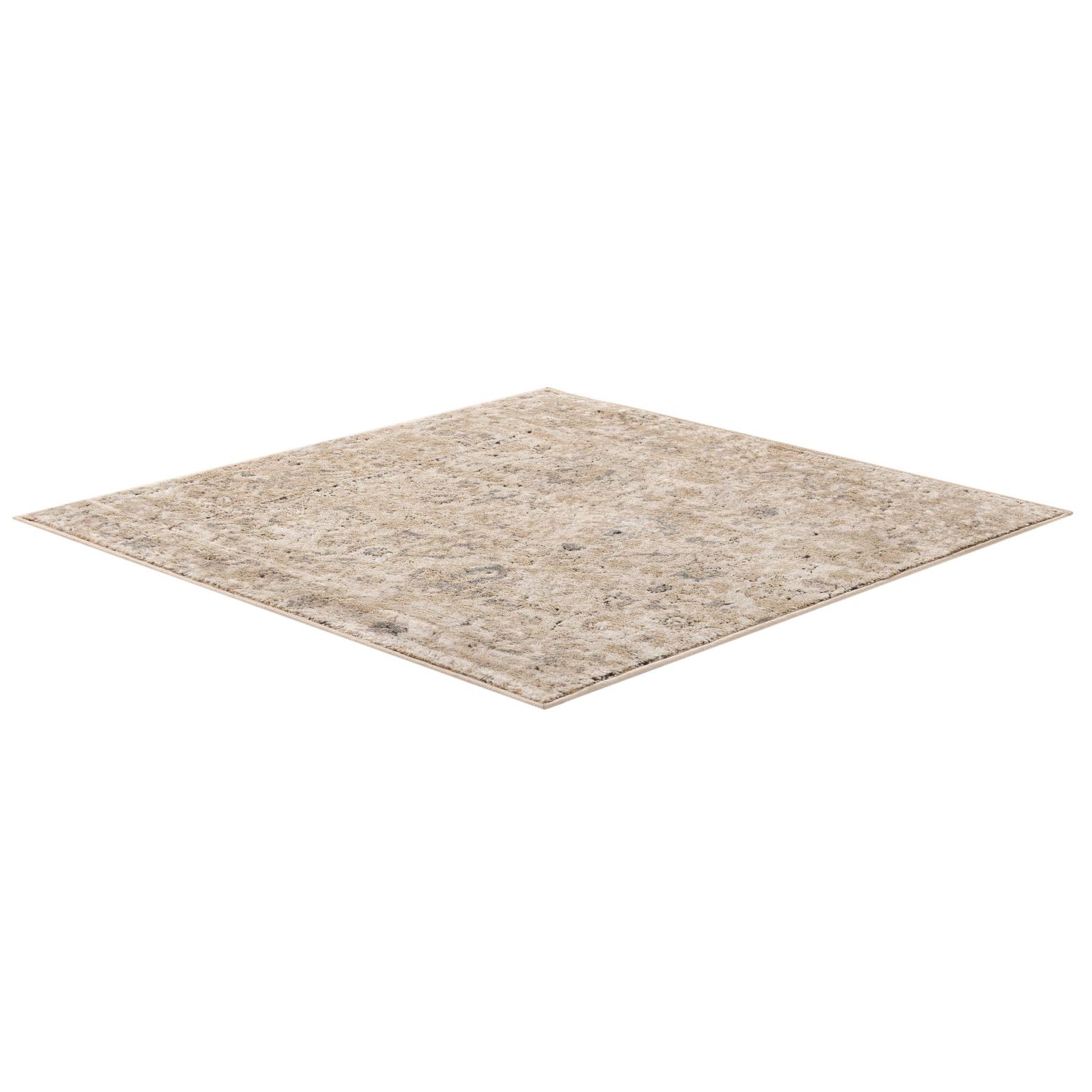 A square 3'x3' ivory and cream rug with a subtle distressed pattern, ideal for an indoor patio.
