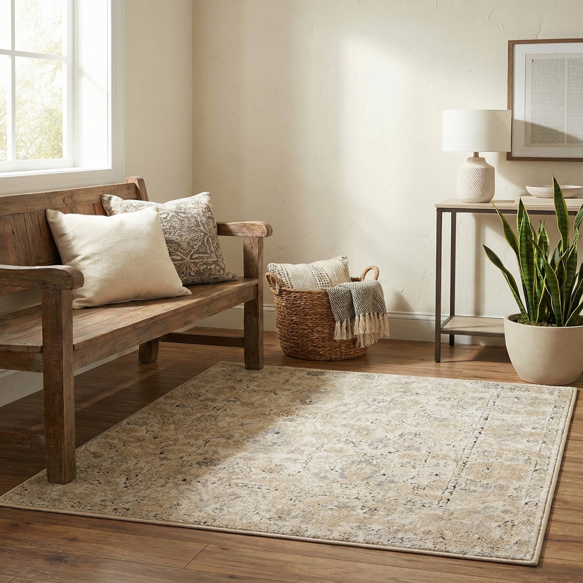 This neutral palette and gentle patina work well in a range of interiors — place it beneath a small coffee table in a cozy living room, use it to anchor a reading nook, or set it beside the bed to warm up a bedroom floor. It also pairs nicely with light-wood furniture, linen upholstery and layered textiles in coastal, transitional or modern farmhouse schemes.
