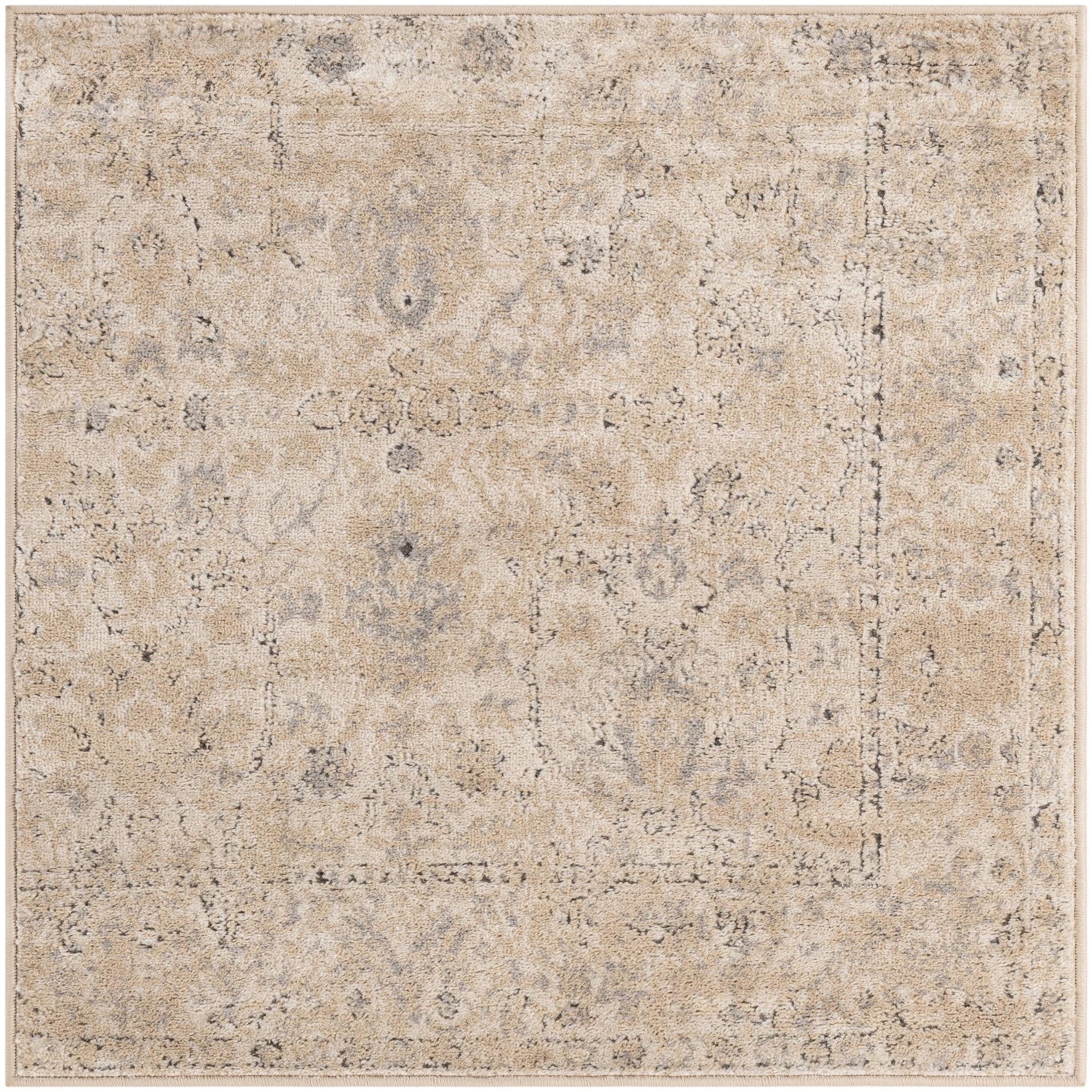 A softly distressed, vintage-inspired pattern rests on an ivory ground, where faded medallion and floral motifs emerge in warm beige, tan and cool gray accents. The low-contrast design creates a lived-in look without heavy contrast, and a subtle border frames the field for a relaxed, traditional feel. Machine-made from 85% polypropylene and 15% polyester, the pile has a soft, low-profile texture that feels cushioned underfoot while maintaining a neat, uniform surface.
