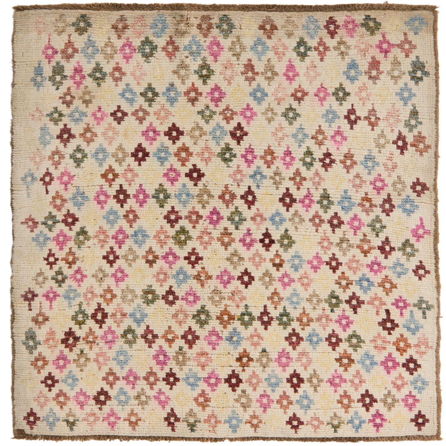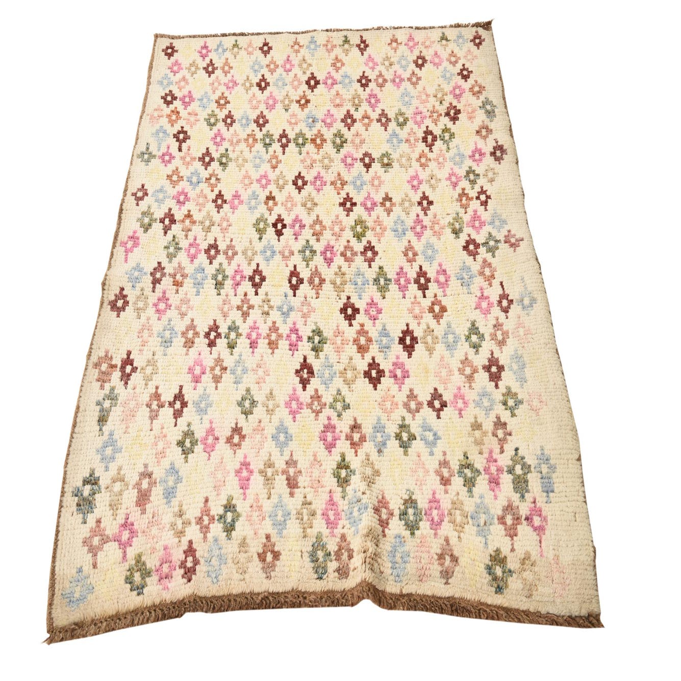 A 3x4 rectangular Rugs.com Balouch rug featuring a cream background with a repeating tribal pattern of colorful diamonds in pink, blue, green, and brown.