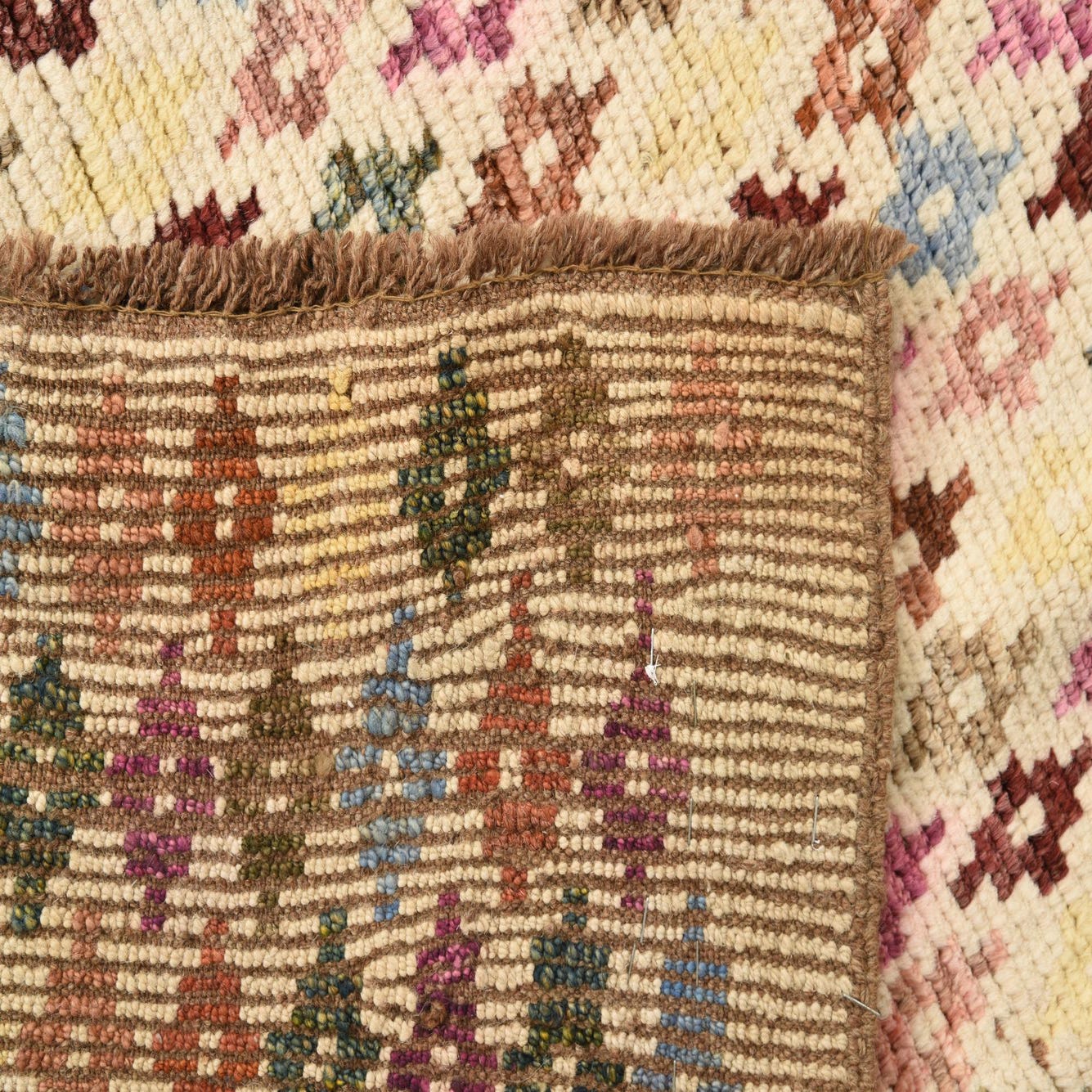 Primary color is Ivory. Colors in this rug include: Ivory, Beige, Blue, Brown, Burgundy, Light Blue, Light Brown, Light Green, Light Salmon, Pink, Yellow, Olive.