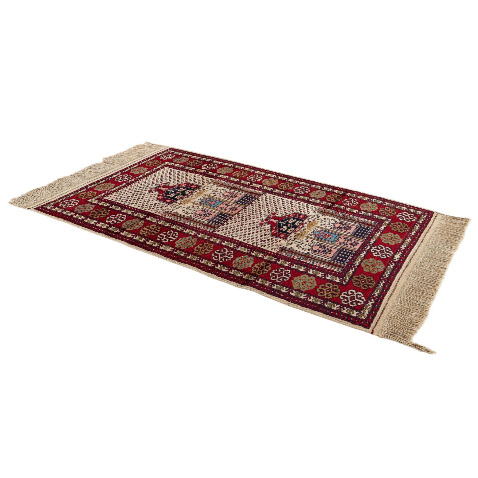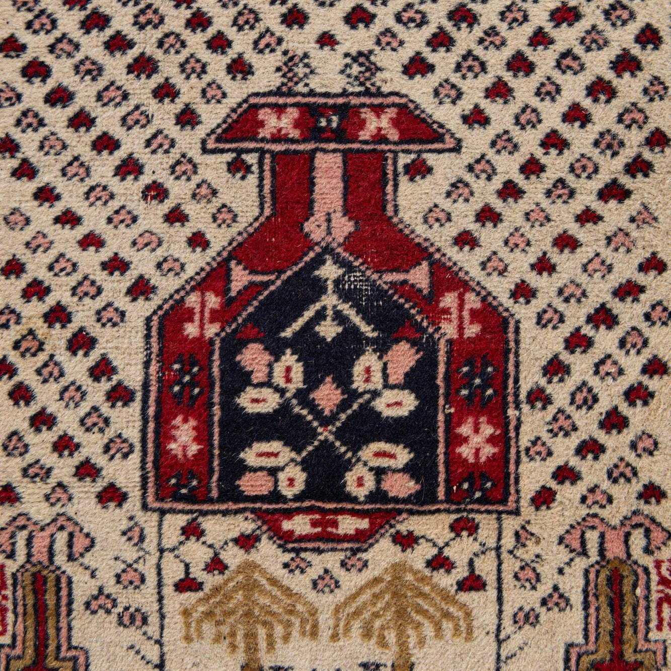 A 3x4 rectangular Bokhara rug with a cream field, intricate tribal patterns in red, navy, and pink, and fringed ends.
