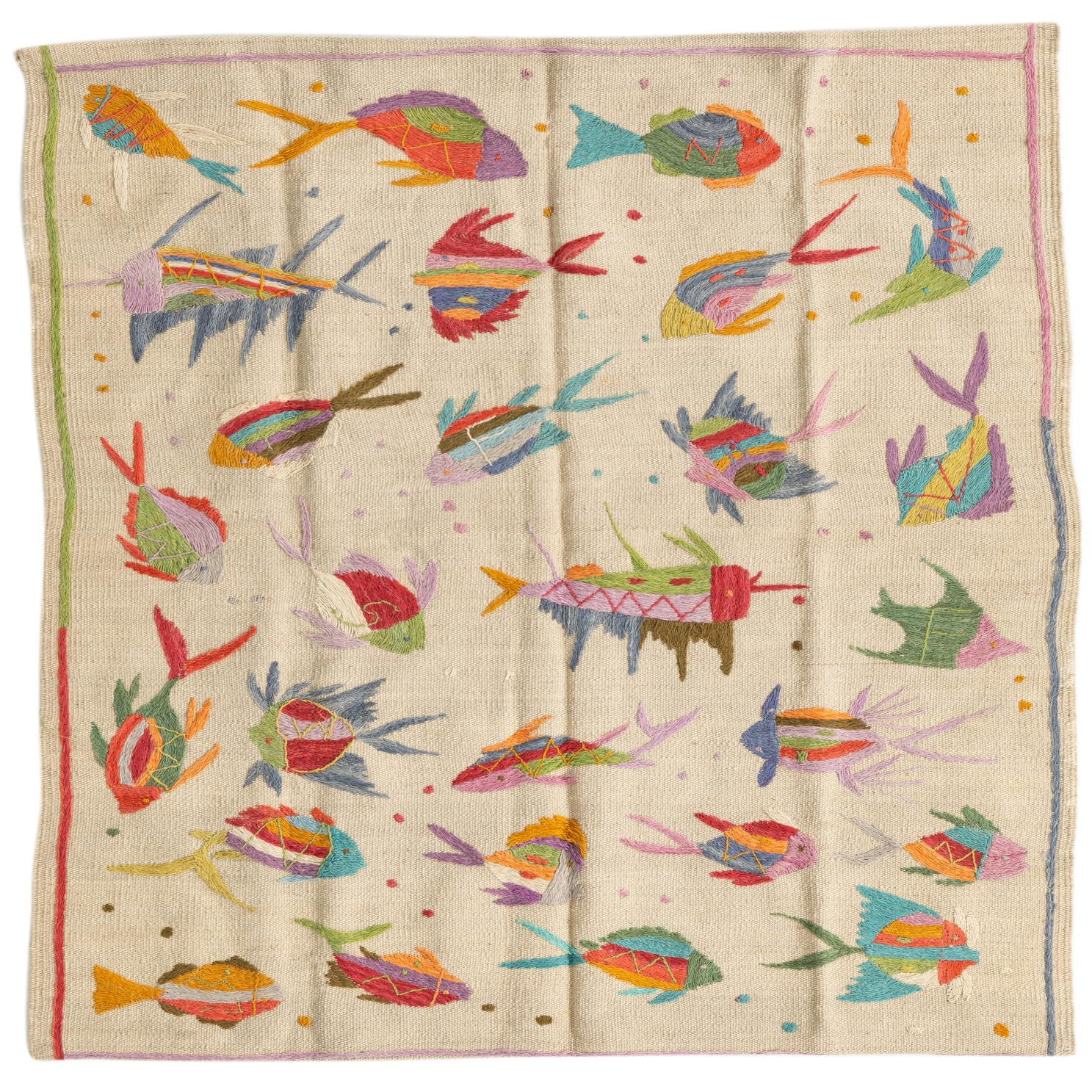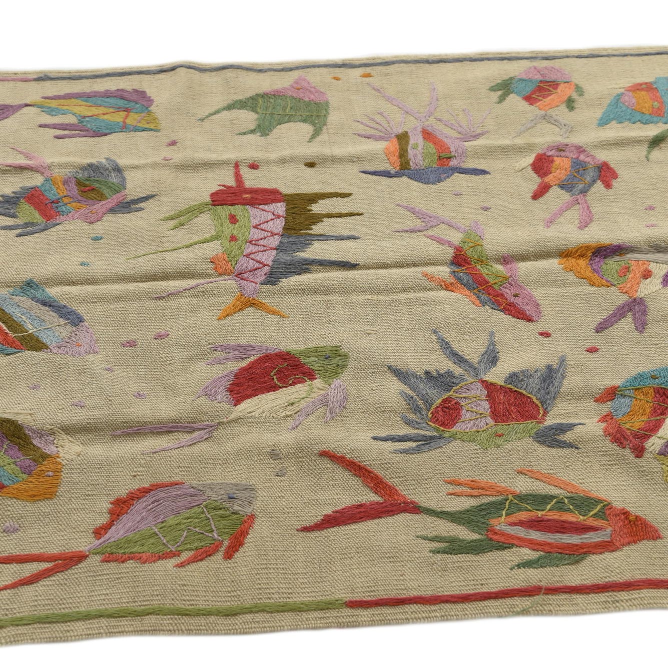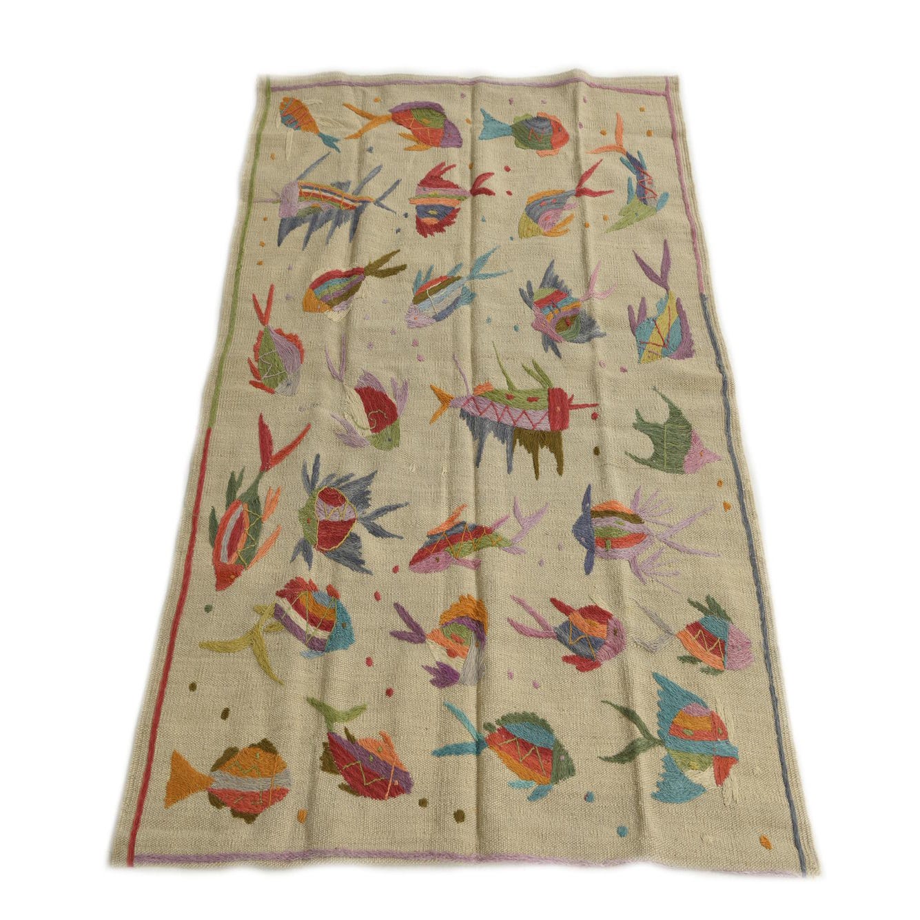 A 3x4 rectangular ivory flatweave rug featuring colorful embroidered tribal fish patterns, suitable for indoor spaces.