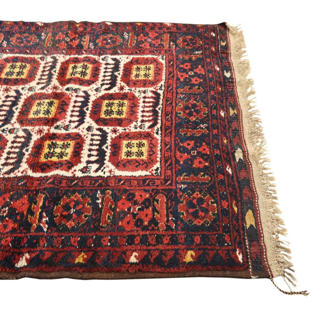 A 3x5 rectangular Afghan Akhche rug featuring a traditional tribal pattern in ivory, cream, red, and navy blue, with a thin pile.