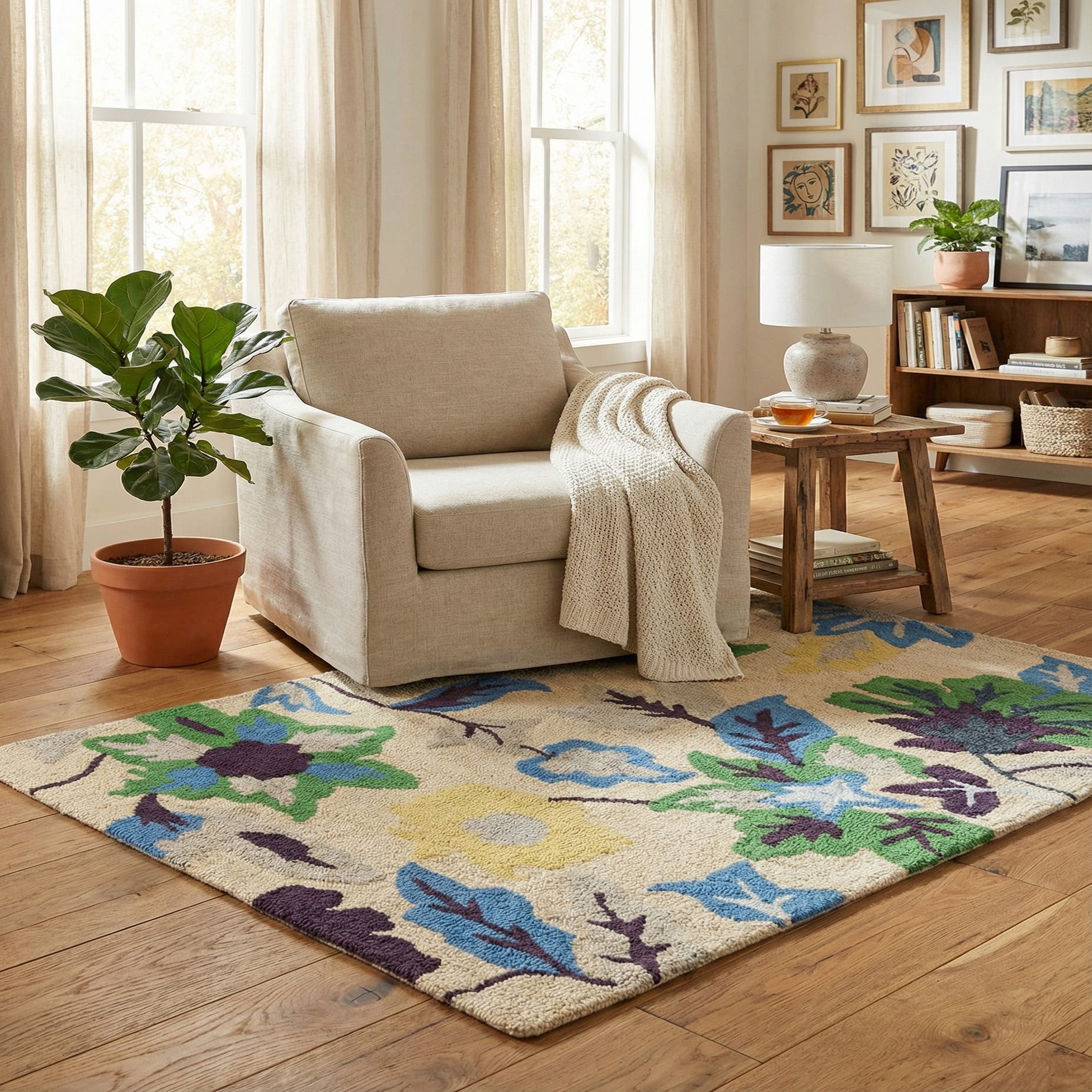 A 3x5 rectangular ivory rug with a modern floral pattern in shades of blue, green, yellow, and purple.