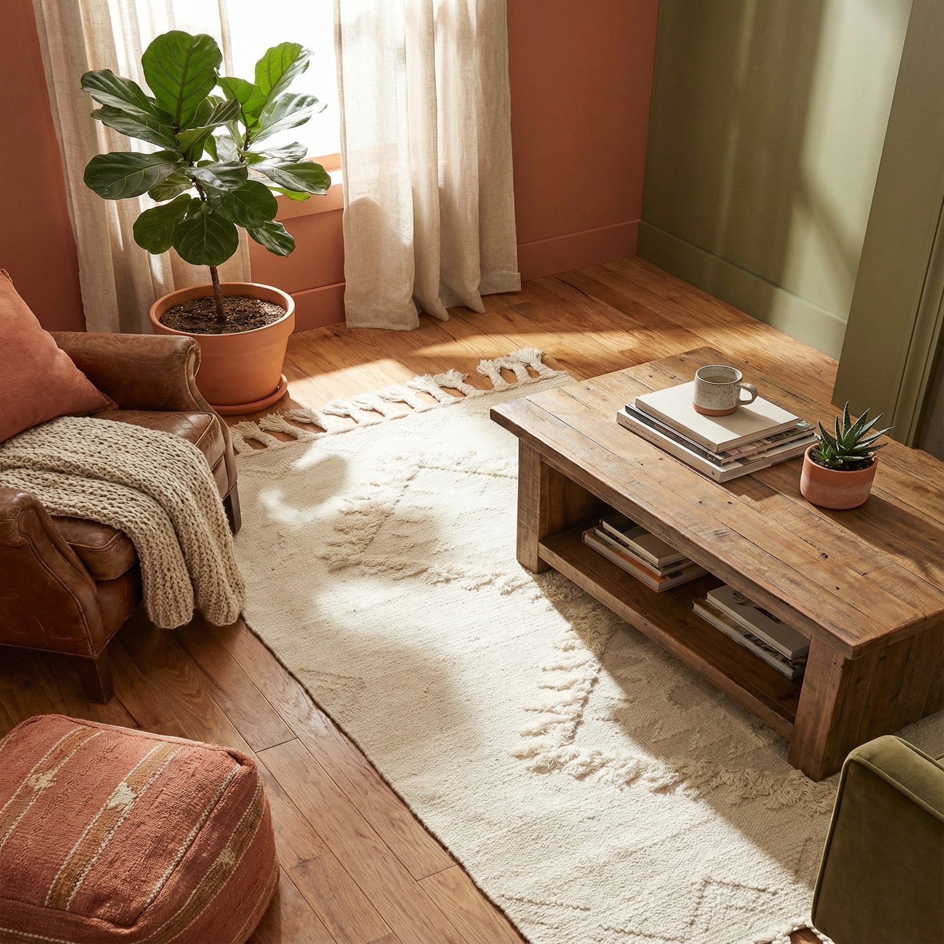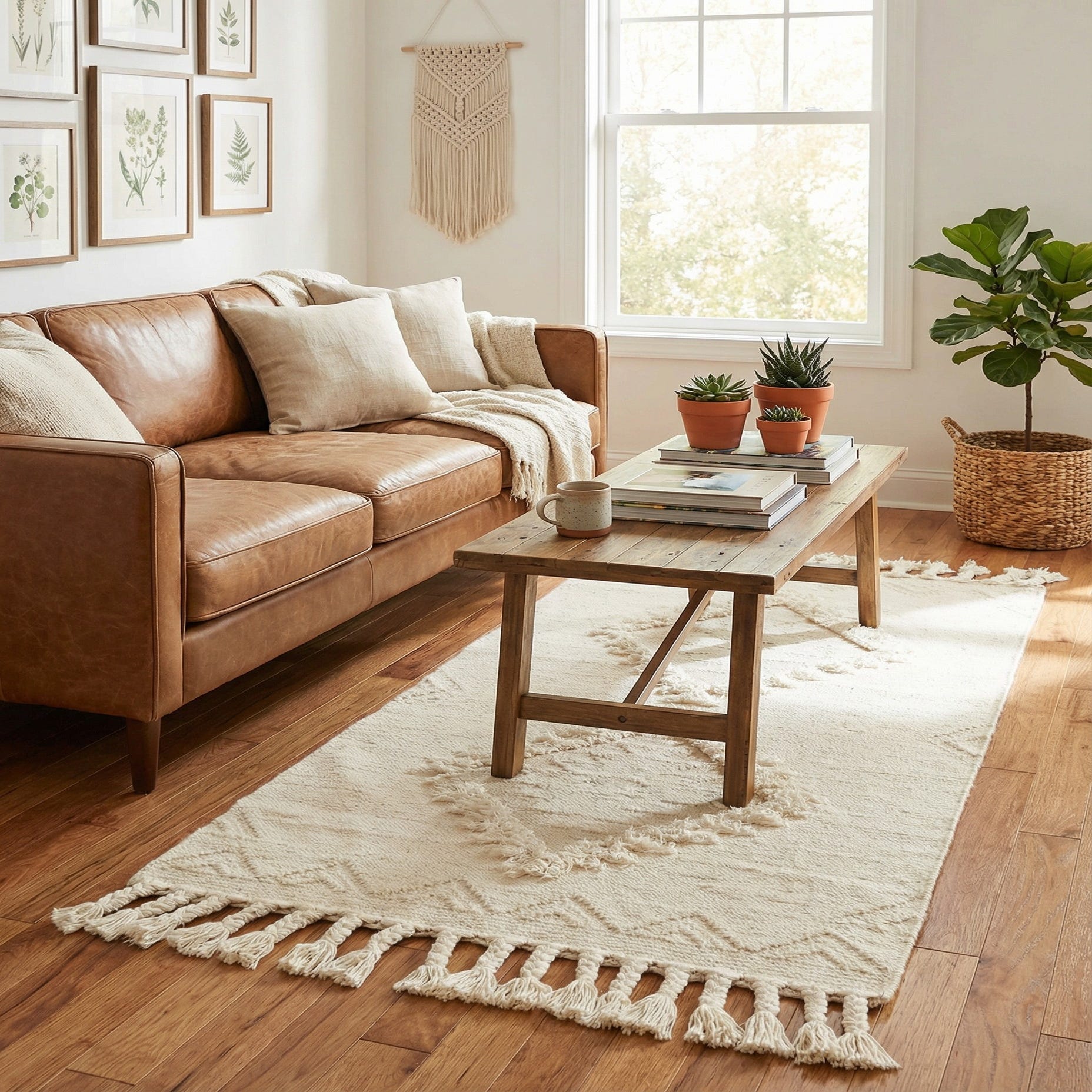 Works well in calm, layered spaces where subtle texture matters: place it in a cozy reading nook under a lounge chair, at the foot of a bed to soften a minimalist bedroom, or in an entryway to introduce warmth without strong color. Pair with light-washed woods, linen upholstery, rattan details, or matte metal accents for a relaxed Scandinavian, modern farmhouse, or casual bohemian look.