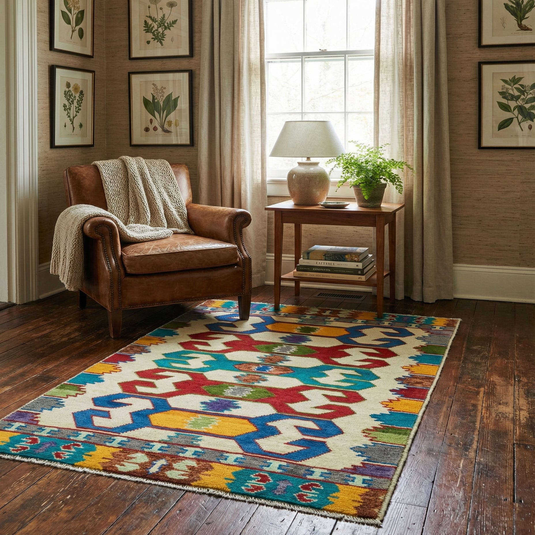 Primary color is Ivory. Colors in this rug include: Ivory, Blue, Gold, Green, Navy Blue, Violet, Red.