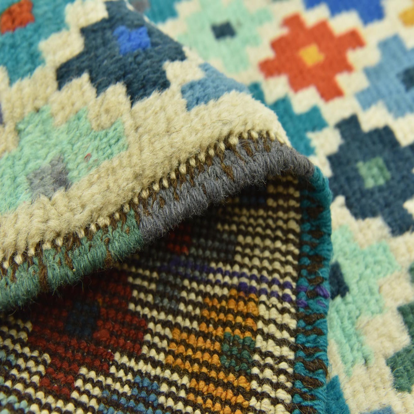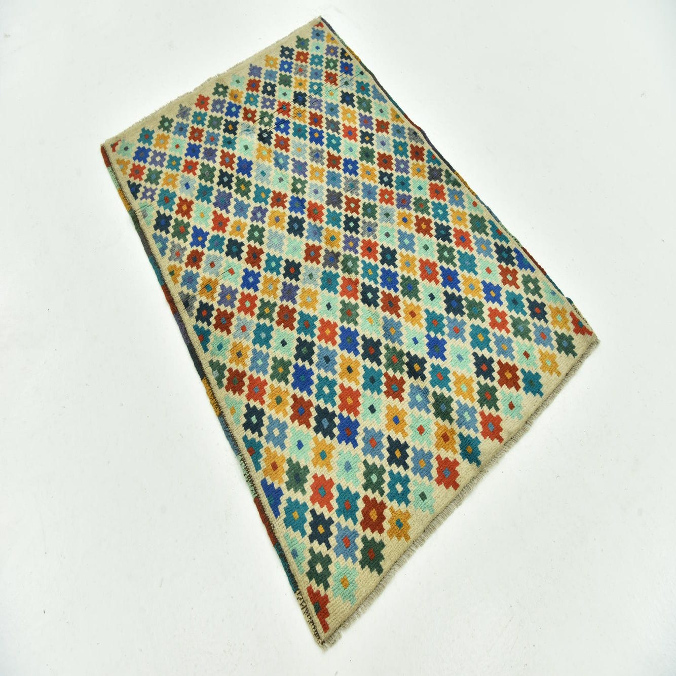 A 3x5 rectangular Balouch rug with a tribal pattern of colorful diamonds on an ivory background.