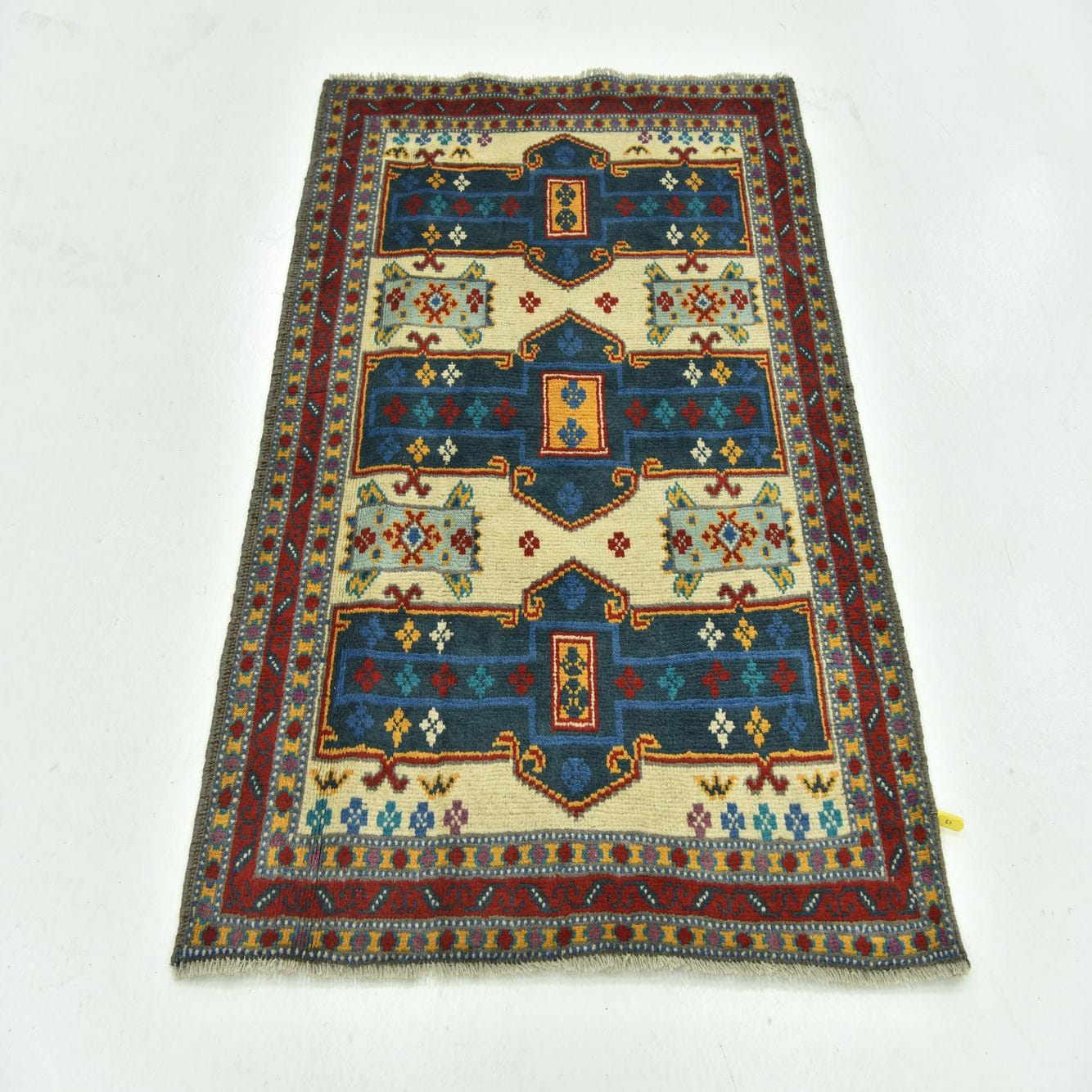 A 3x5 rectangular Balouch rug with an ivory field, featuring a central tribal pattern in deep blues, reds, and yellows, framed by a multi-colored border.