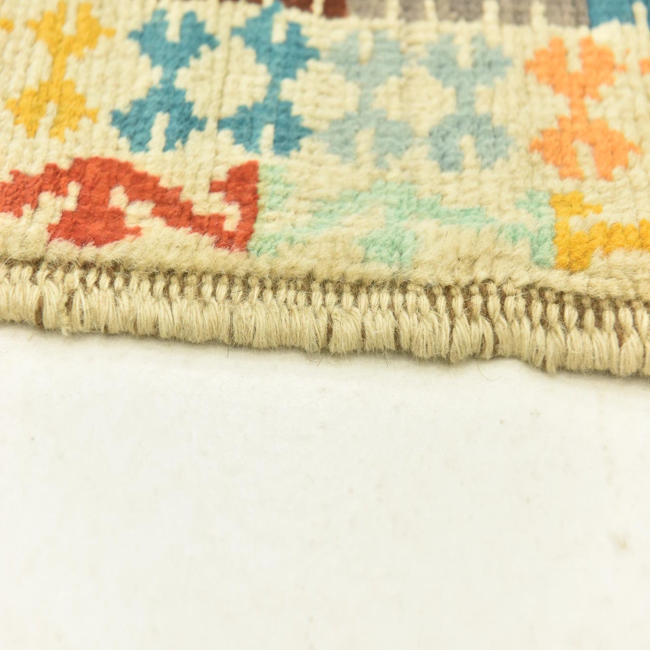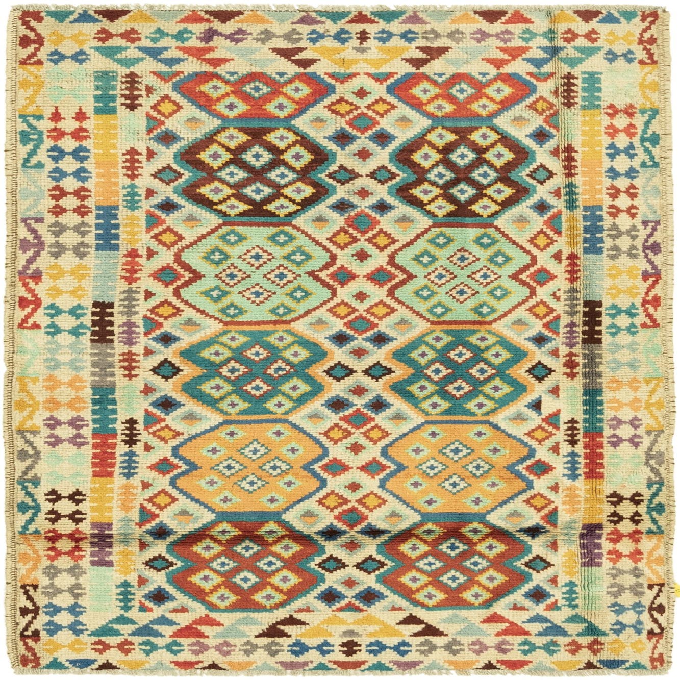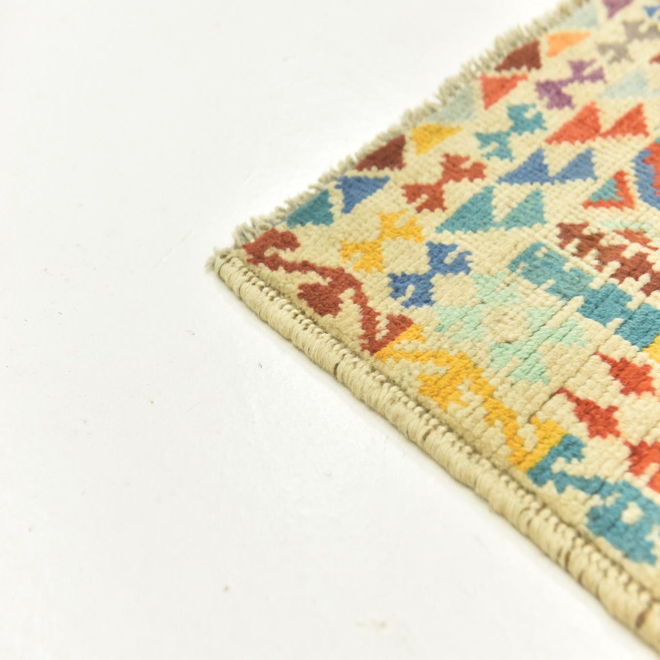 Primary color is Ivory. Colors in this rug include: Ivory, Blue, Gray, Green, Brown, Orange, Red, Pink, Purple.