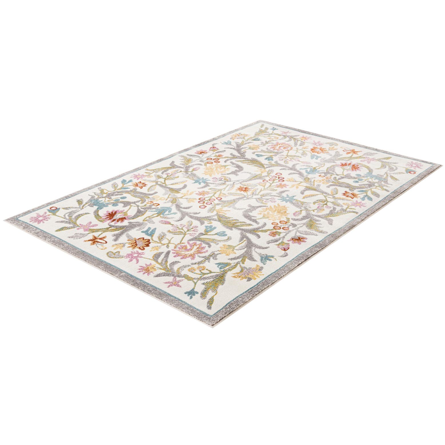 A 3x5 rectangular ivory rug with a vibrant floral pattern featuring yellow, pink, blue, and brown flowers and green and grey leaves.