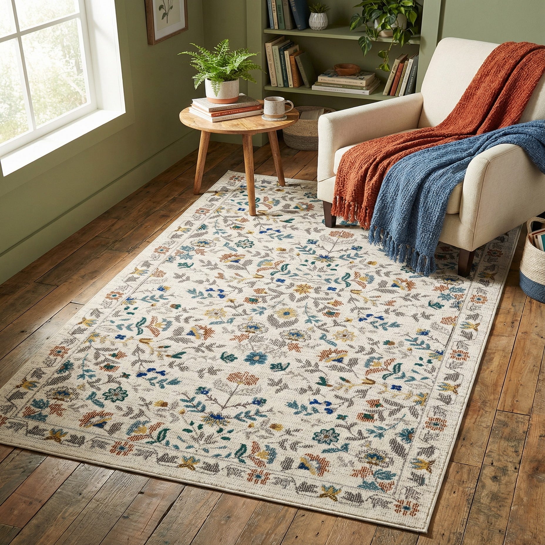 Primary color is Ivory. Colors in this rug include: Ivory, Blue, Gray, Green, Rust Red, Yellow.