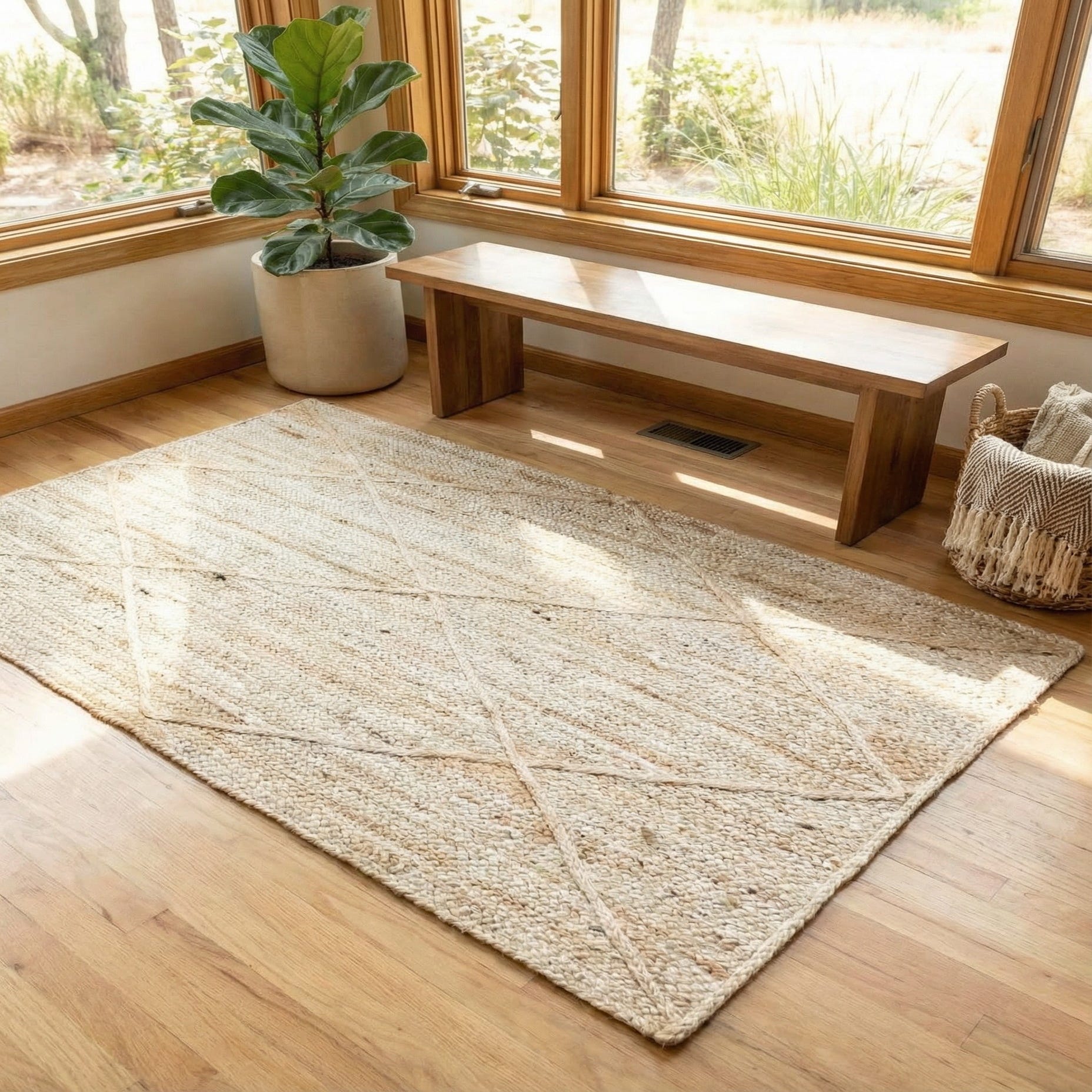 Hand-braided from 100% jute, this rug pairs a soft ivory ground with natural tan braided accents that form a large-scale diamond lattice. The tight braiding creates a low-profile surface with subtle ridges and a pleasantly textured hand — you can feel the natural fiber underfoot while the tonal variations in the jute add depth without competing with other finishes.