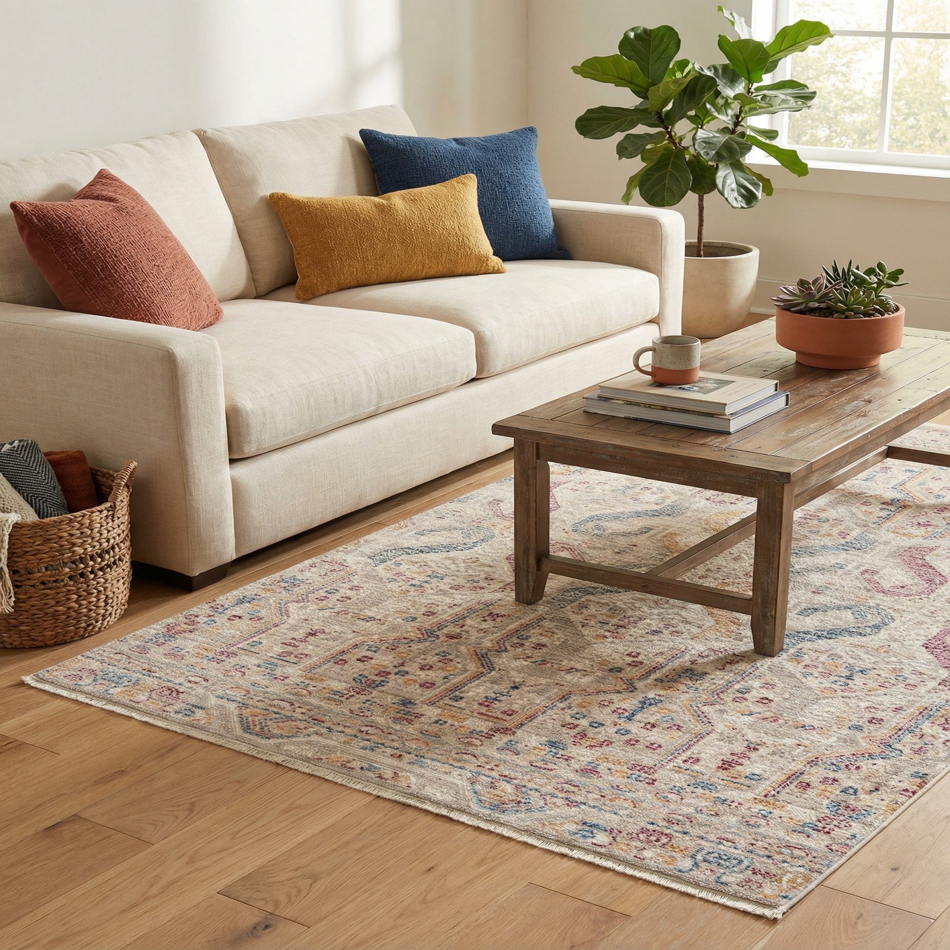 Machine-made from 100% polyester, the rug has a low, smooth pile with a subtle sheen and a bit of textural definition where the motifs are rendered. It lays flat and anchors seating areas beautifully — tuck it beneath a coffee table in a living room, layer it at the foot of a bed, or place it under a small desk in a home office. Works especially well with light wood tones and soft neutrals, pairs nicely with navy or charcoal upholstery for contrast, and adds a gentle color lift to rooms with brass or gold accents.