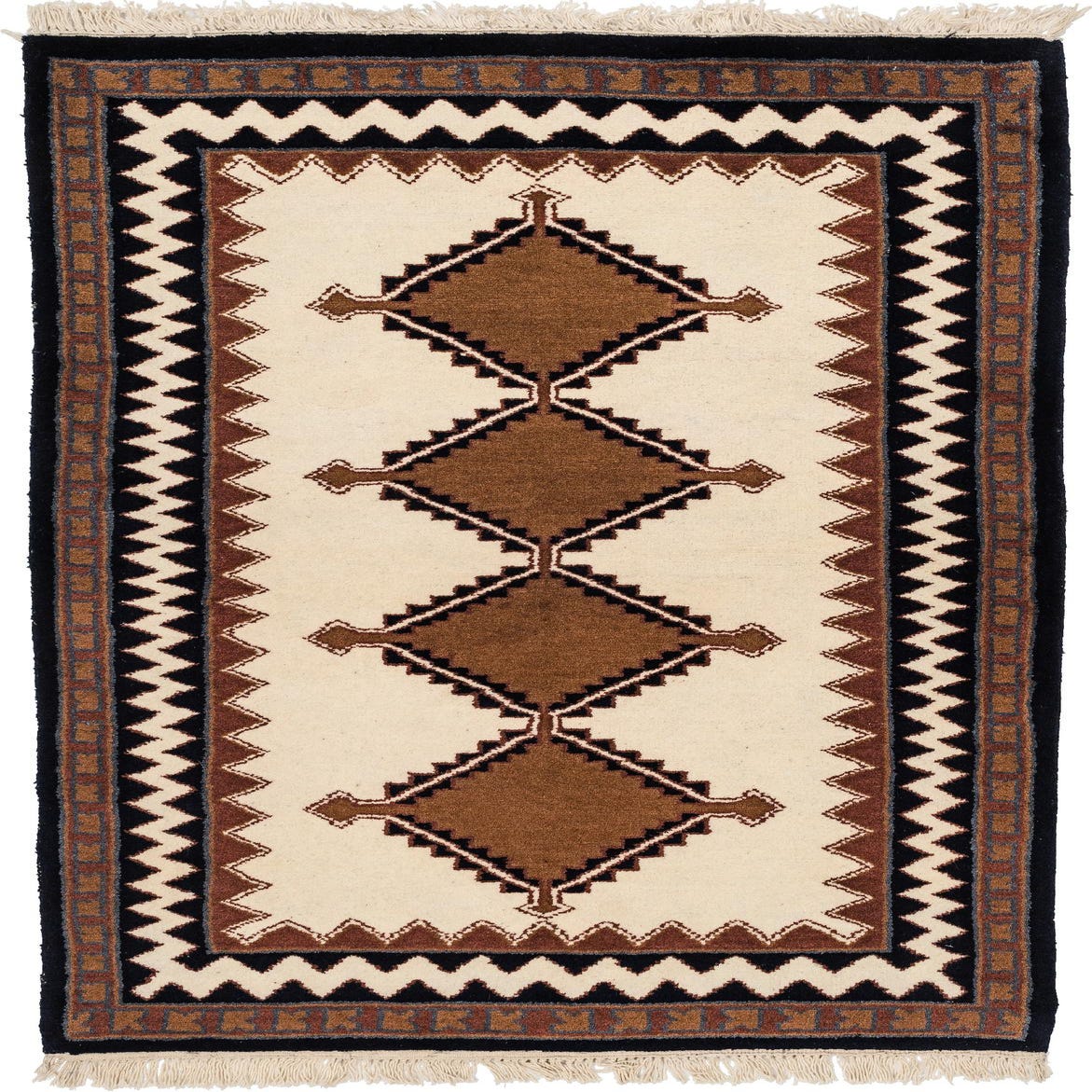 A 3x5 rectangular ivory tribal wool rug with brown geometric diamonds and a black border, featuring fringe.