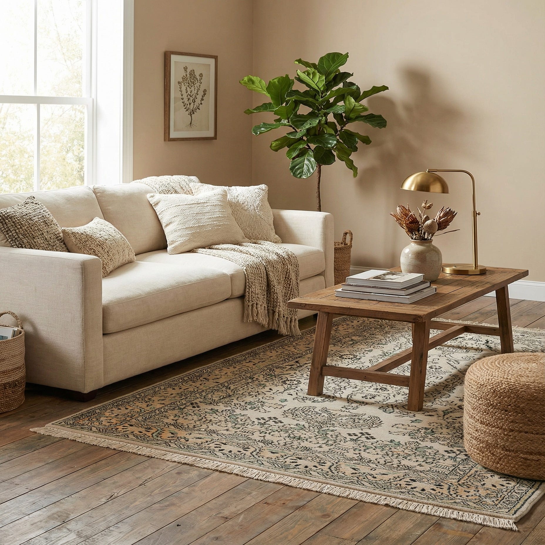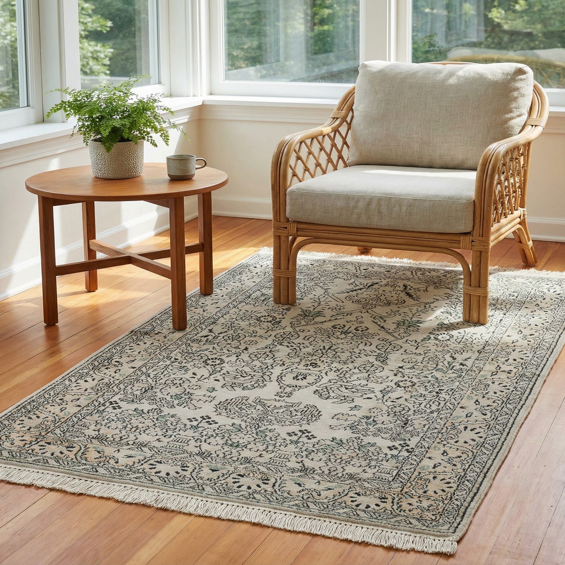 A 3x5 rectangular ivory and cream wool rug with a traditional floral and oriental pattern, featuring black and green accents.