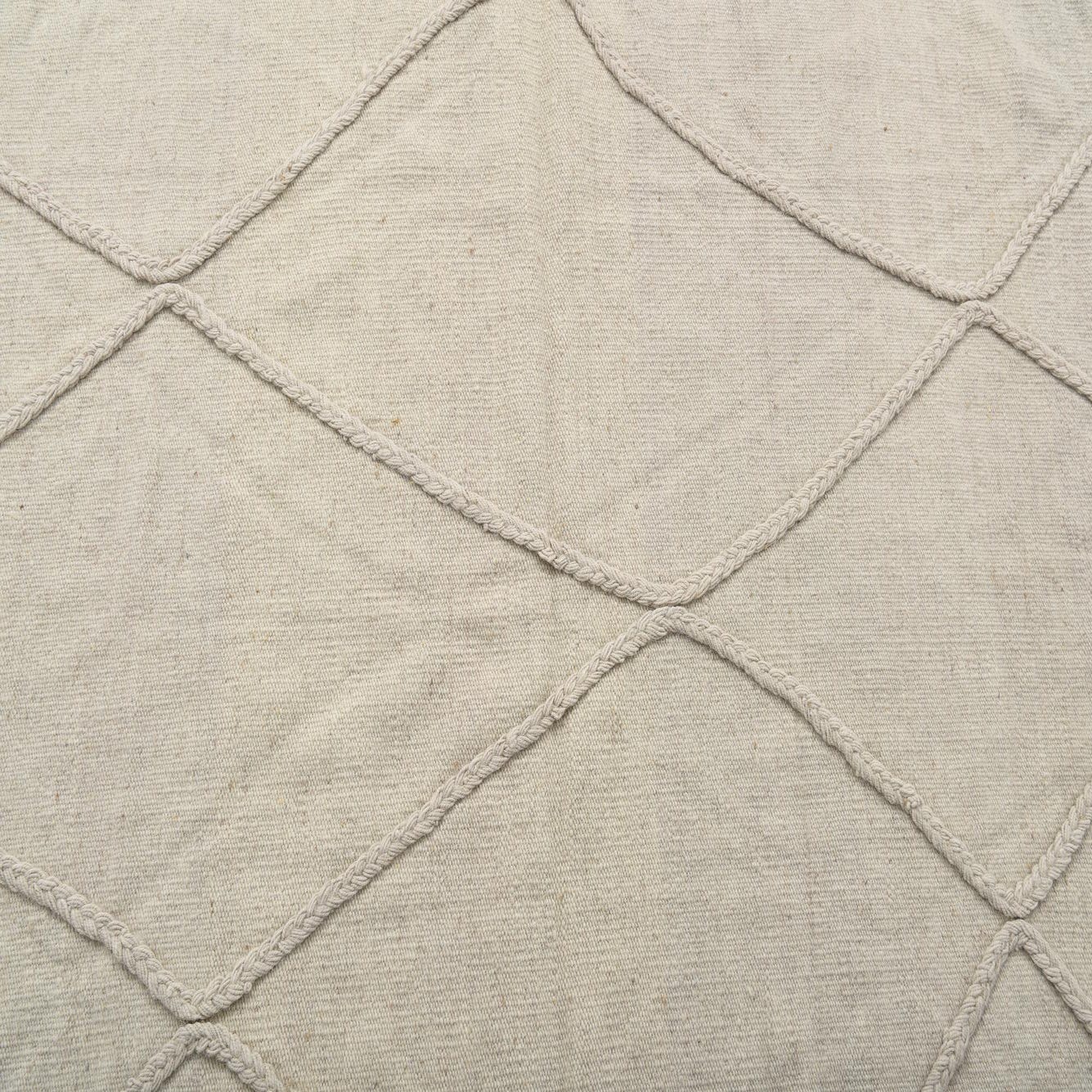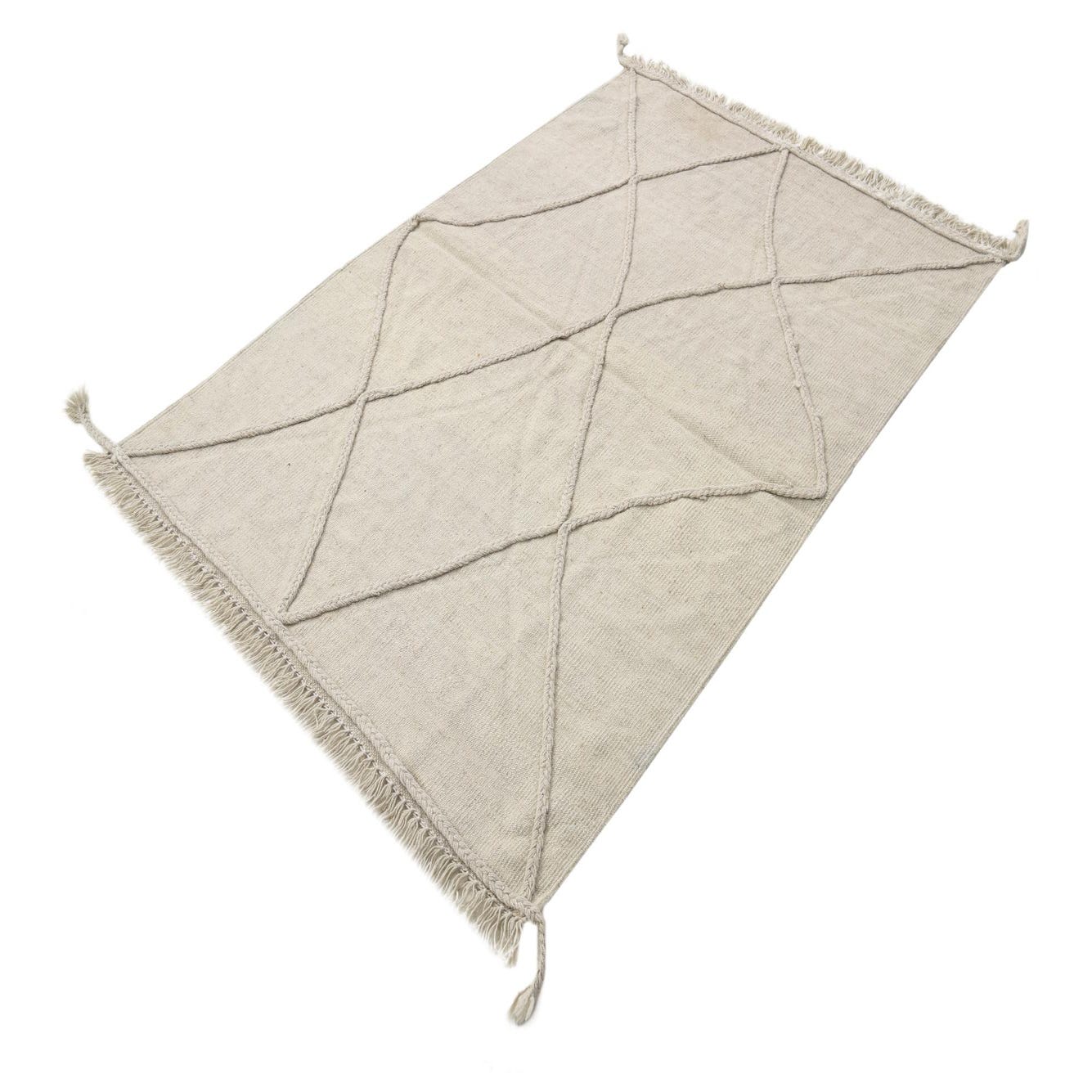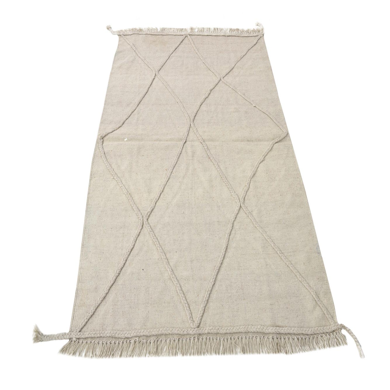 A 3x5 rectangular ivory flatweave rug with a raised braided diamond pattern and fringed edges.
