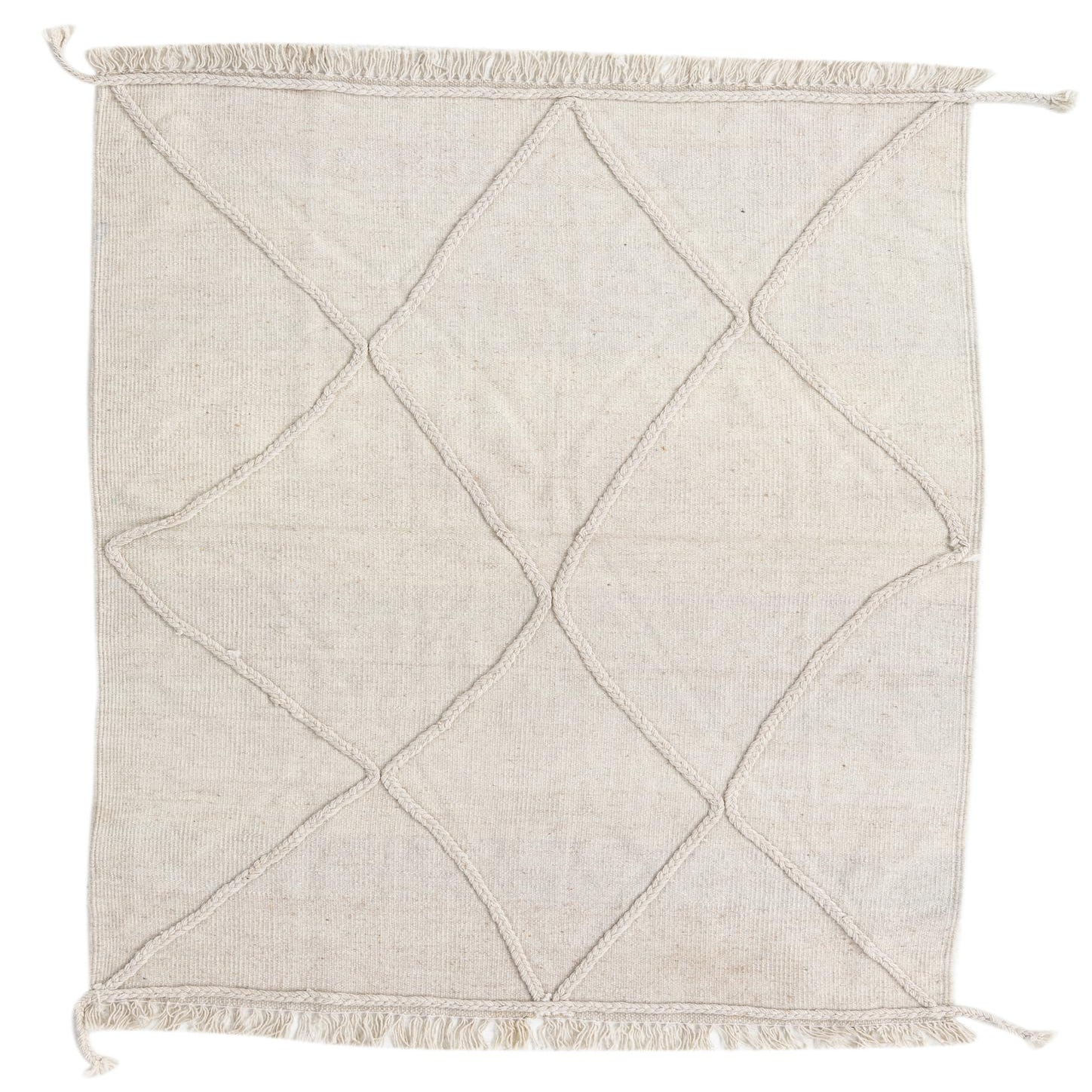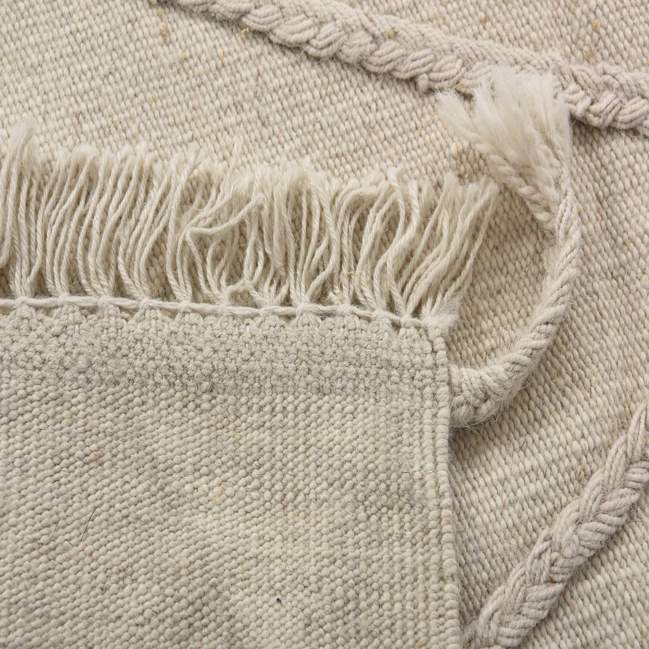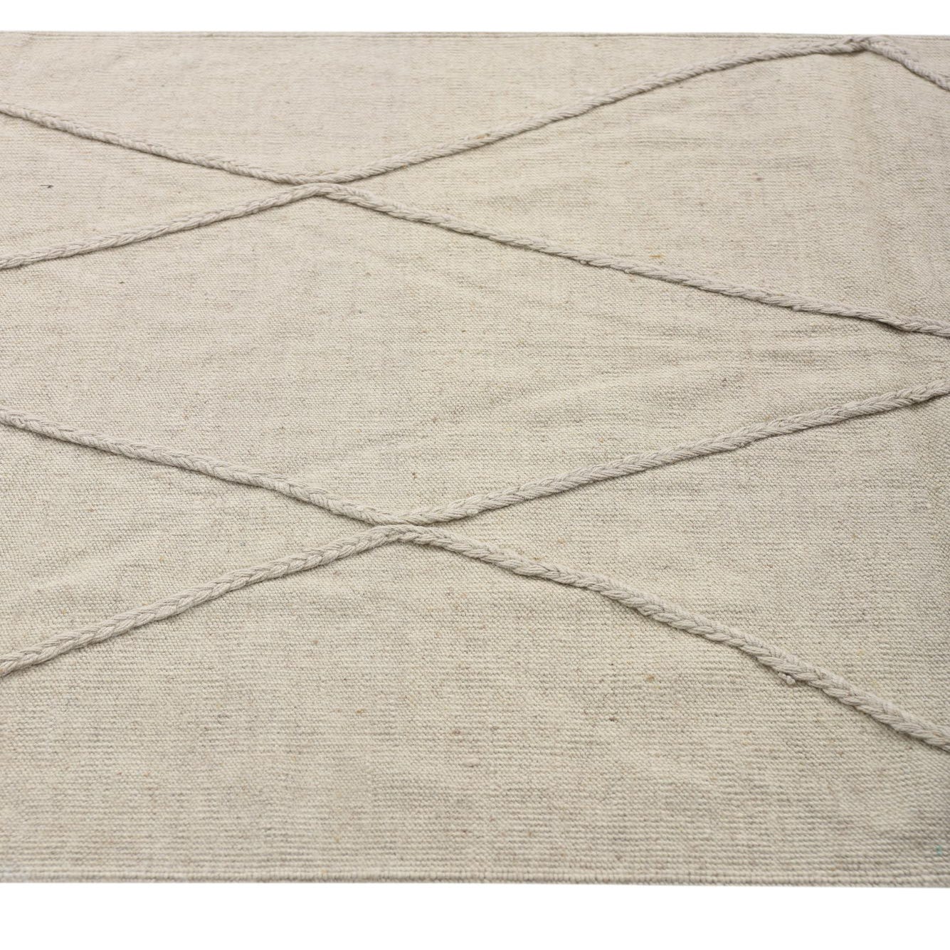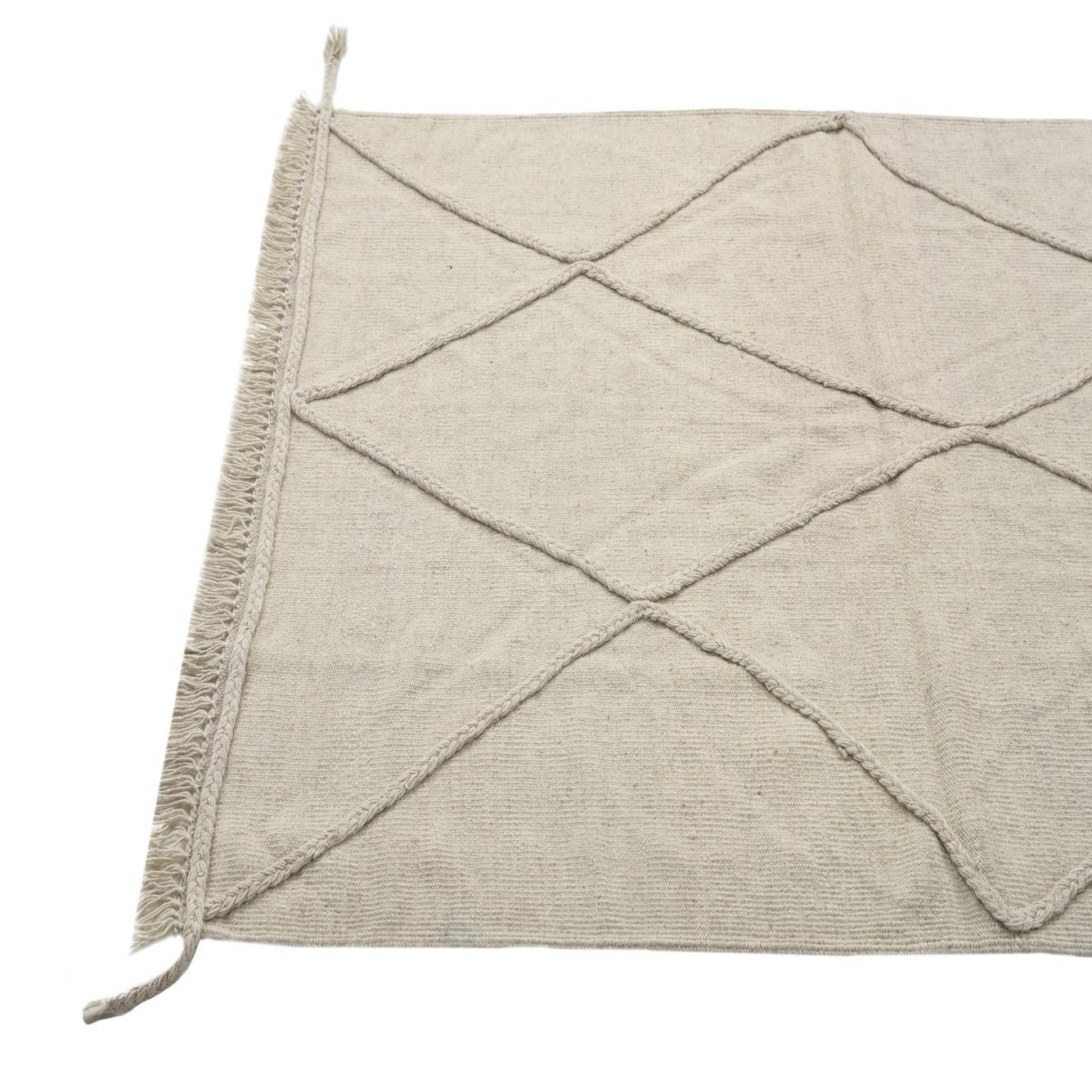 A 3x5 rectangular ivory flatweave rug with a raised braided diamond pattern and fringed edges.